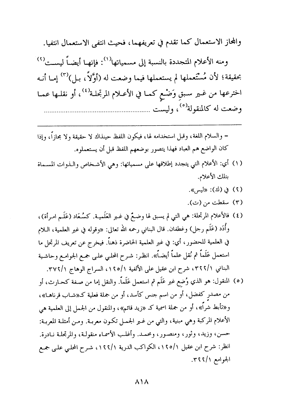 (¬٥) المنقول: هو الذي وُضِع غير عَلَم ثم استعمل عَلَمًا. والنقل إما من صفة كحارث، أو من مصدرٍ كفضل، أو من اسم جنس كأسد، أو من جملة فعلية كـ "شاب قرناها"، و"تأبط شرًا"، أو من جملة اسمية كـ "زيد قائم"، والمنقول من الجمل إلى العلمية هي الأعلام المركبة وهي مبنية، والتي من غير الجمل تكون معربة. ومن أمثلة المعربة: حسن، وزيد، وثور، ومنصور، ومحمد. وأغلب الأسماء منقولة، والمرتجلة نادرة. انظر: شرح ابن عقيل ١/ ١٢٥، الكواكب الدرية ١/ ١٢٢، شرح المحلى على جمع الجوامع ١/ ٣٢٢.