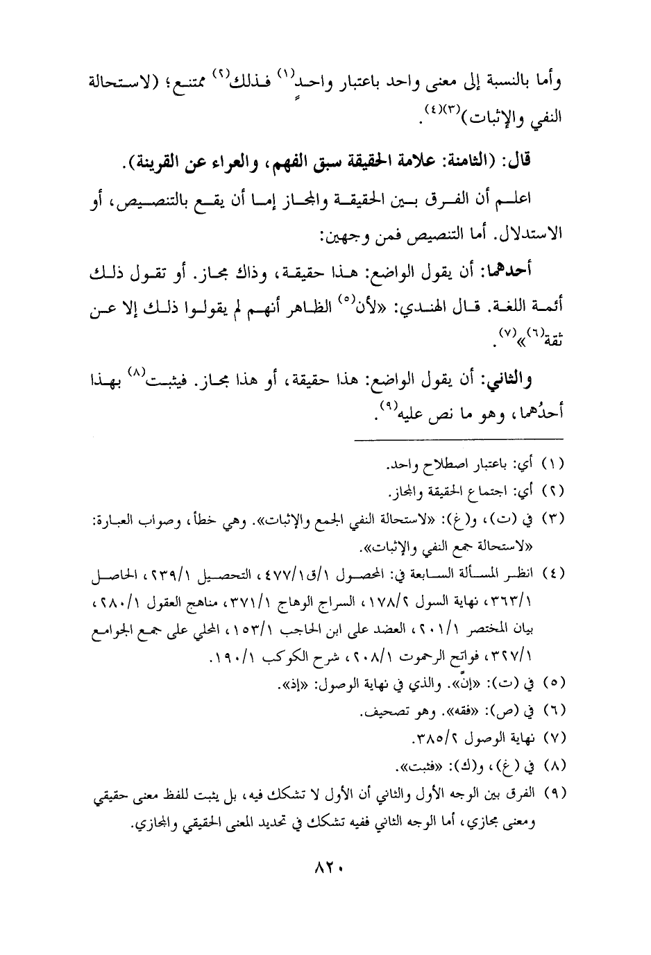(¬٤) انظر المسألة السابعة في: المحصول ١/ ق ١/ ٤٧٧، التحصيل ١/ ٢٣٩، الحاصل ١/ ٣٦٣، نهاية السول ٢/ ١٧٨، السراج الوهاج ١/ ٣٧١، مناهج العقول ١/ ٢٨٠، بيان المختصر ١/ ٢٠١، العضد على ابن الحاجب ١/ ١٥٣، المحلى على جمع الجوامع ١/ ٣٢٧، فوات الرحموت ١/ ٢٠٨، شرح الكوكب ١/ ١٩٠.