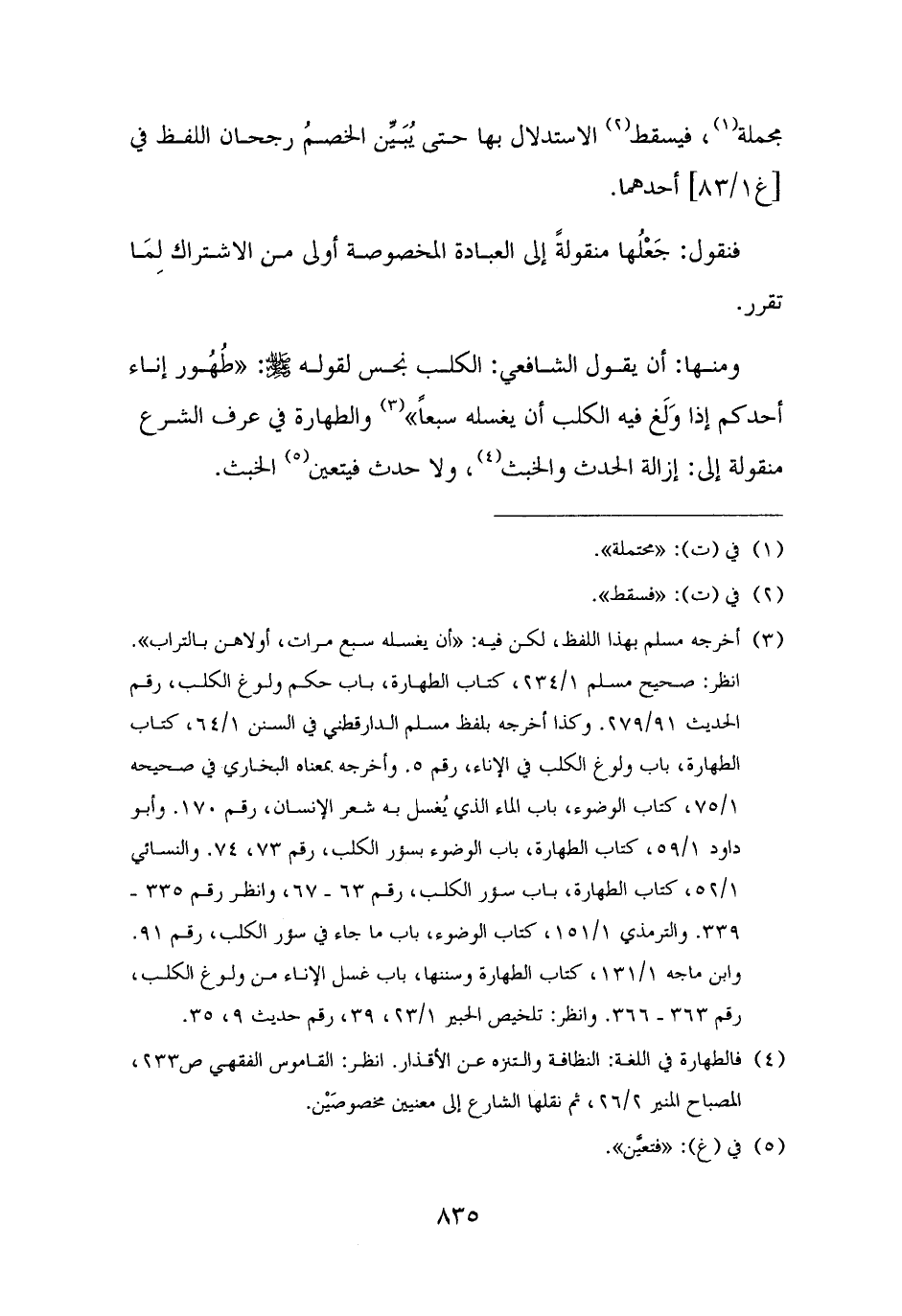 ومنها: أن يقول الشافعي: الكلب نجس لقوله - صلى الله عليه وسلم -: "طُهُور إناء أحدكم إذا وَلَغ فيه الكلب أن يغسله سبعًا" (¬٣) والطهارة في عرف الشرع منقولة إلى: إزالة الحدث والخبث (¬٤)، ولا حدث فيتعين (¬٥) الخبث.