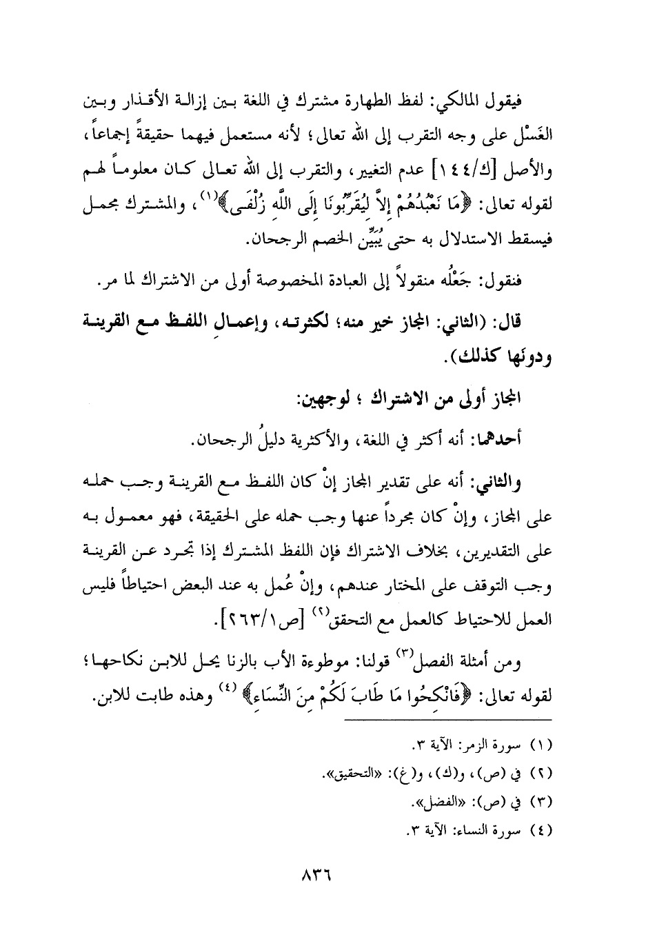 فيقول المالكي: لفظ الطهارة مشترك في اللغة بين إزالة الأقذار وبين الغَسْل على وجه التقرب إلى الله تعالى؛ لأنه مستعمل فيهما حقيقةً إجماعًا، والأصل عدم التغيير، والتقرب إلى الله تعالى كان معلومًا لهم لقوله تعالى: {مَا نَعْبُدُهُمْ إِلَّا لِيُقَرِّبُونَا إِلَى اللَّهِ زُلْفَى} (¬١)، والمشترك مجمل فيسقط الاستدلال به حتى يُبَيِّن الخصم الرجحان.