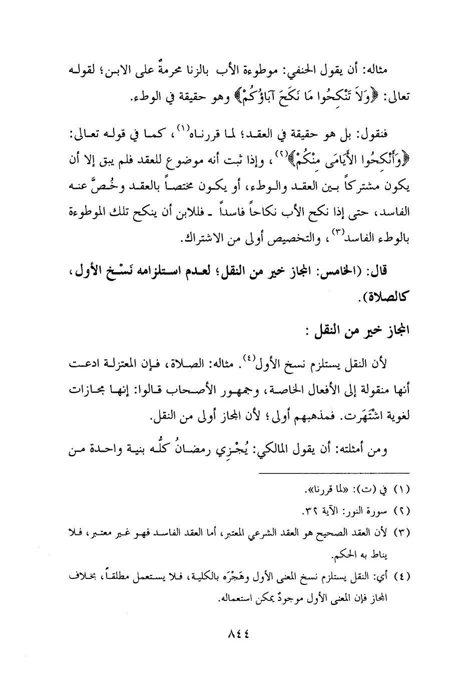(¬٤) أي: النقل يستلزم نسخ المعنى الأول وهَجْرَه بالكلية، فلا يستعمل مطلقًا، بخلاف المجاز فإن المعنى الأول موجودٌ يمكن استعماله.