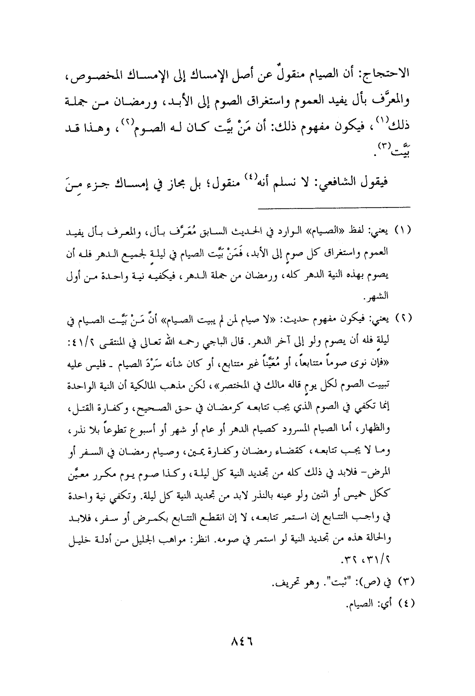 (¬٢) يعني: فيكون مفهوم حديث: "لا صيام لمن لم يبيت الصيام" أنَّ مَنْ بَيَّت الصيام في ليلةٍ فله أن يصوم ولو إلى آخر الدهر. قال الباجي رحمه الله تعالى في المنتقى ٢/ ٤١: "فإن نوى صومًا متتابعًا، أو مُعَيَّنًا غير متتابع، أو كان شأنه سَرْدَ الصيام - فليس عليه تبييت الصوم لكل يومٍ قاله مالك في المختصر"، لكن مذهب المالكية أن النية الواحدة إنما تكفي في الصوم الذي يجب تتابعه كرمضان في حق الصحيح، وكفارة القتل، والظهار، أما الصيام المسرود كصيام الدهر أو عام أو شهر أو أسبوع تطوعًا بلا نذر، وما لا يجب تتابعه، كقضاء رمضان وكفارة يمين، وصيام رمضان في السفر أو المرض - فلا بد في ذلك كله من تجديد النية كل ليلة، وكذا صوم يوم مكرر معيَّن ككل خميس أو اثنين ولو عينه بالنذر لا بد من تجديد النية كل ليلة. وتكفي نية واحدة في واجب التتابع إن استمر تتابعه، لا إن انقطع التتابع بمرض أو سفر، فلا بد والحالة هذه من تجديد النية لو استمر في صومه. انظر: مواهب الجليل من أدلة خليل ٢/ ٣١، ٣٢.