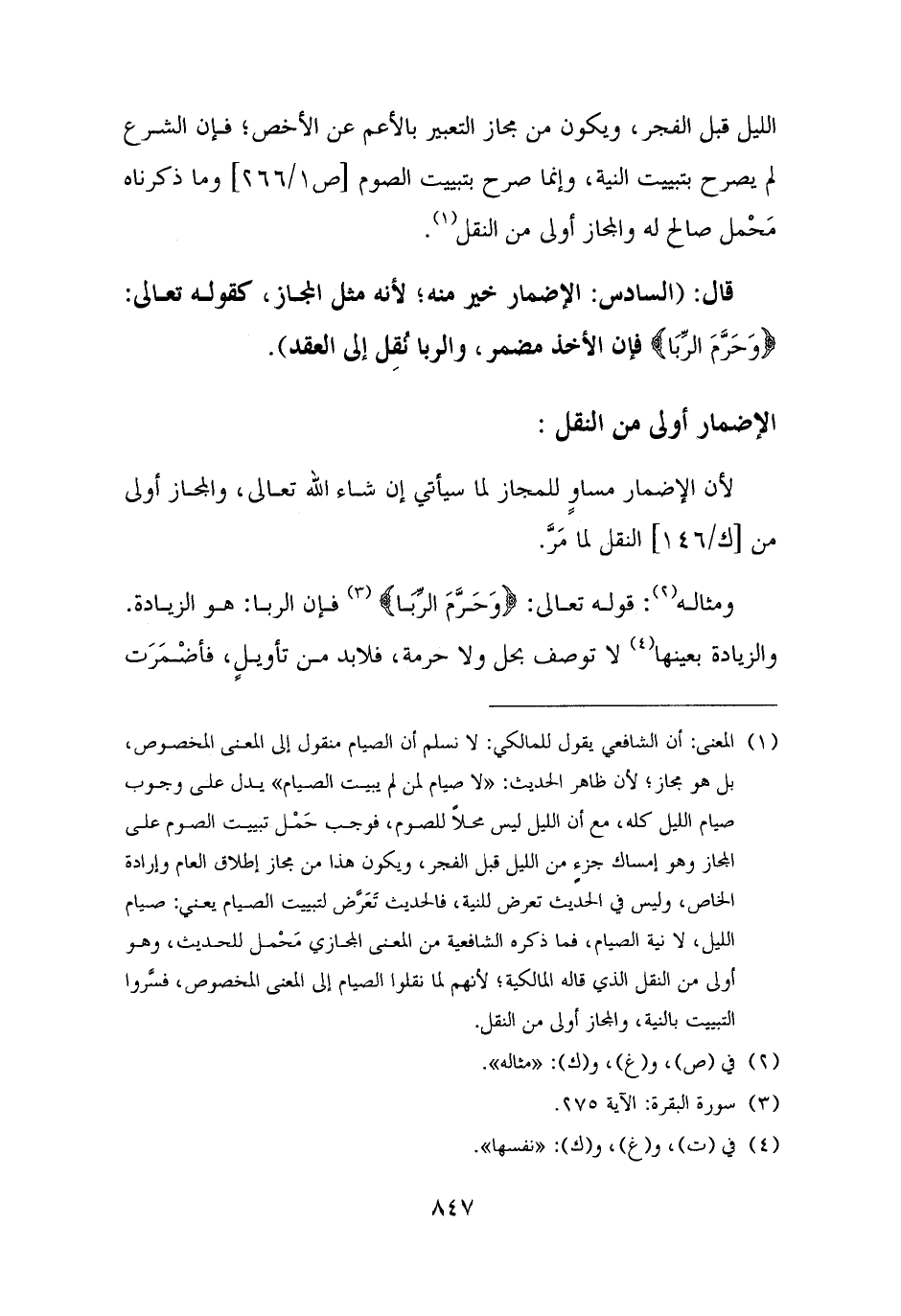 ومثاله (¬٢): قوله تعالى: {وَحَرَّمَ الرِّبَا} (¬٣) فإن الربا: هو الزيادة. والزيادة بعينها (¬٤) لا توصف بحل ولا حرمة، فلا بد من تأويل، فأضْمَرَت