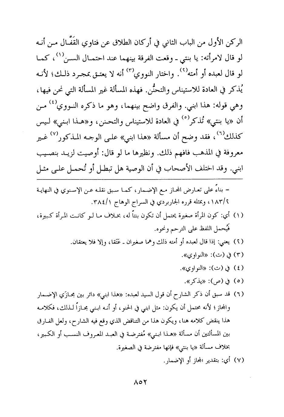 (¬٦) قد سبق أن ذكر الشارح أن قول السيد لعبده: "هذا ابني" دائر بين مجازَي الإضمار والمجاز؛ لأنه محتمل أن يكون: مثل ابني في الحنو، أو أنه ابني مجازًا لذلك، فكلامه هذا ينقض كلامه هنا، ويكون هذا من التناقض الذي وقع فيه الشارح، ولعل الفارق بين المسألتين أن مسألة "هذا ابني" مُفترضة في العبد المعروف النسب أو الكبير، بخلاف مسألة "يا بنتي" فإنها مفترضة في الصغيرة.