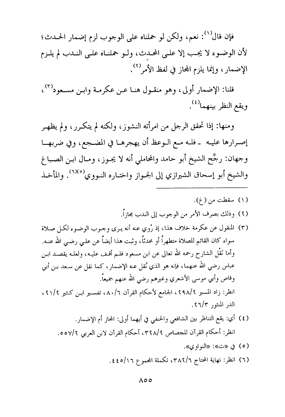 (¬٣) المنقول عن عكرمة خلاف هذا، إذ رُوي عنه أنه يرى وجوب الوضوء لكل صلاة سواء كان القائم للصلاة متطهرًا أو محدثًا، وثبت هذا أيضًا عن علي رضي الله عنه. وأما نَقْل الشارح رحمه الله تعالى عن ابن مسعود فلم أقف عليه، ولعله يقصد ابن عباس رضي الله عنهما، فإنه هو الذي نُقل عنه الإضمار، كما نقل عن سعد بن أبي وقاص وأبي موسى الأشعري وغيرهم رضي الله عنهم جميعًا.