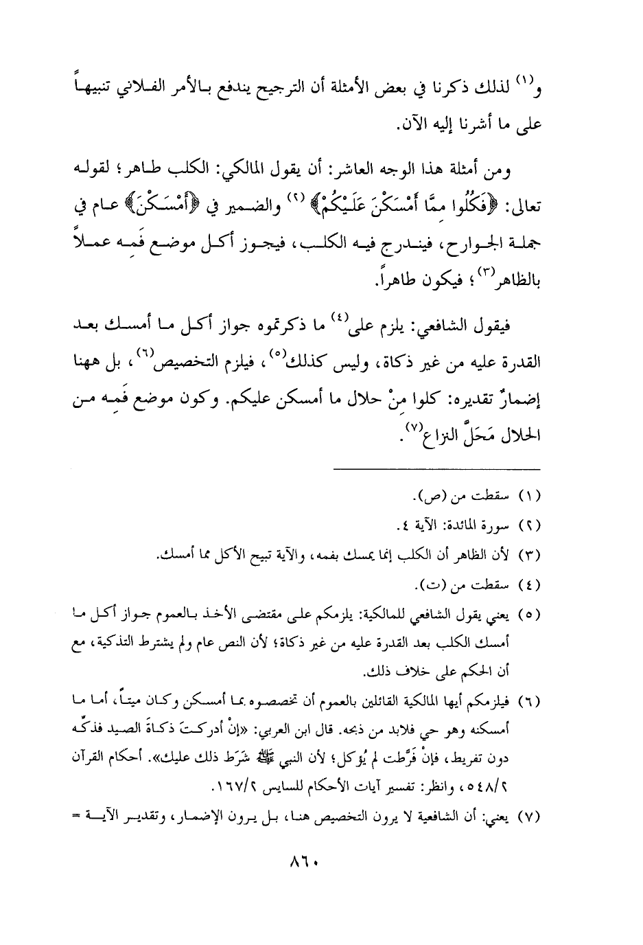 (¬٦) فيلزمكم أيها المالكية القائلين بالعموم أن تخصصوه بما أمسكن وكان ميتًا, أما ما أمسكنه وهو حي فلا بد من ذبحه. قال ابن العربي: "إنْ أدركتَ ذكاةَ الصيد فذكِّه دون تفريط، فإنْ فَرَّطت لم يُؤكل؛ لأن النبي - صلى الله عليه وسلم - شَرَط ذلك عليك". أحكام القرآن ٢/ ٥٤٨، وانظر: تفسير آيات الأحكام للسايس ٢/ ١٦٧.