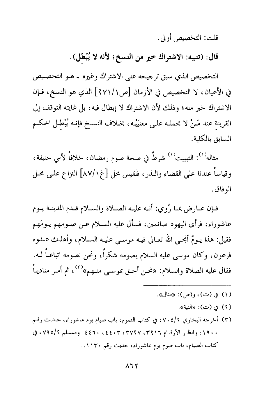 التخصيص الذي سبق ترجيحه على الاشتراك وغيره - هو التخصيص في الأعيان، لا التخصيص في الأزمان الذي هو النسخ، فإن الاشتراك خير منه؛ وذلك لأن الاشتراك لا إبطال فيه, بل غايته التوقف إلى القرينةِ عند مَن لا يحمله على معنيَيْه، بخلاف النسخ فإنه يُبْطِل الحكم السابق بالكلية.