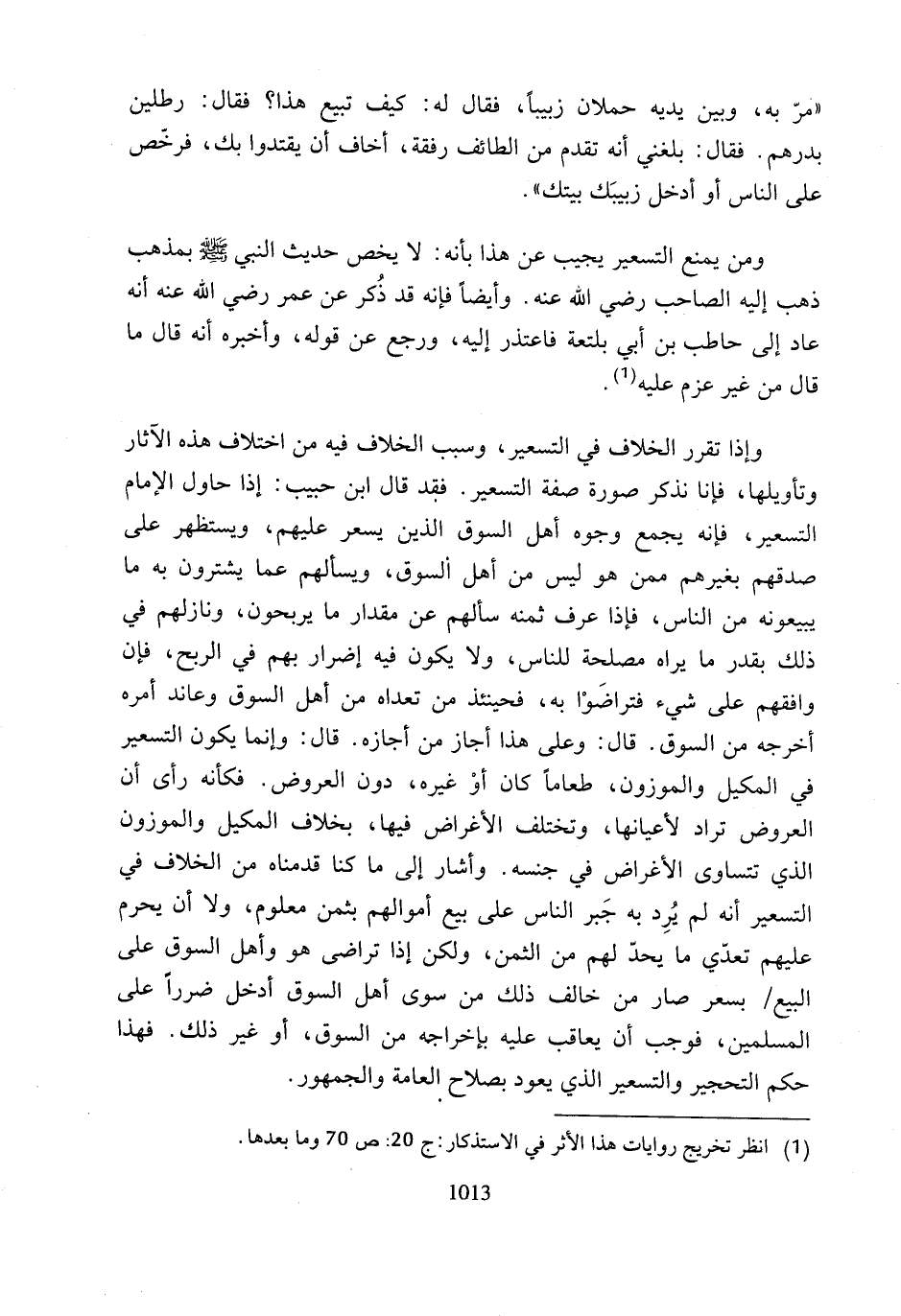 ومن يمنع التسعير يجيب عن هذا بأنه: لا يخص حديث النبي - صلى الله عليه وسلم - بمذهب ذهب إليه الصاحب رضي الله عنه. وأيضًا فإنه قد ذُكر عن عمر رضي الله عنه أنه عاد إلى حاطب بن أبي بلتعة فاعتذر إليه، ورجع عن قوله، وأخبره أنه قال ما قال من غير عزم عليه (¬1).