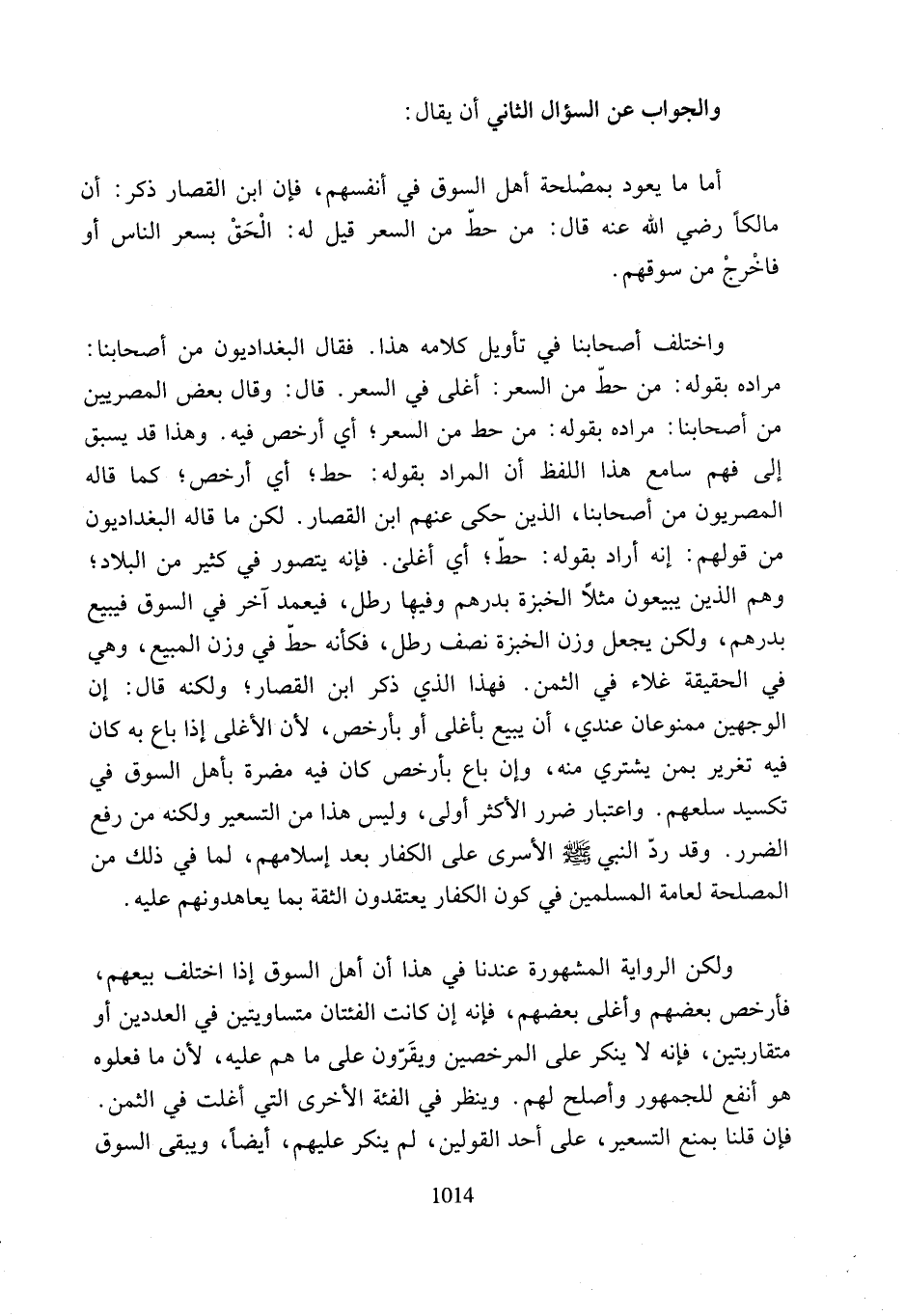 واختلف أصحابنا في تأويل كلامه هذا. فقال البغداديون من أصحابنا: مراده بقوله: من حطّ من السعر: أغلى في السعر. قال: وقال بعض المصريين من أصحابنا: مراده بقوله: من حط من السعر؛ أي أرخص فيه. وهذا قد يسبق إلى فهم سامع هذا اللفظ أن المراد بقوله: حط؛ أي أرخص؛ كما قاله المصريون من أصحابنا، الذين حكى عنهم ابن القصار. لكن ما قاله البغداديون من قولهم: إنه أراد بقوله: حطّ؛ أي أغلى. فإنه يتصور في كثير من البلاد؛ وهم الذين يبيعون مثلًا الخبزة بدرهم وفيها رطل، فيعمد آخر في السوق فيبيع بدرهم، ولكن يجعل وزن الخبزة نصف رطل، فكأنه حطّ في وزن المبيع، وهي في الحقيقة غلاء في الثمن. فهذا الذي ذكر ابن القصار؛ ولكنه قال: إن الوجهين ممنوعان عندي، أن يبيع بأغلى أو بأرخص، لأن الأغلى إذا باع به كان فيه تغرير بمن يشتري منه، وإن باع بأرخص كان فيه مضرة بأهل السوق في تكسيد سلعهم. واعتبار ضرر الأكثر أولى، وليس هذا من التسعير ولكنه من رفع الضرر. وقد ردّ النبي - صلى الله عليه وسلم - الأسرى على الكفار بعد إسلامهم، لما في ذلك من المصلحة لعامة المسلمين في كون الكفار يعتقدون الثقة بما يعاهدونهم عليه.