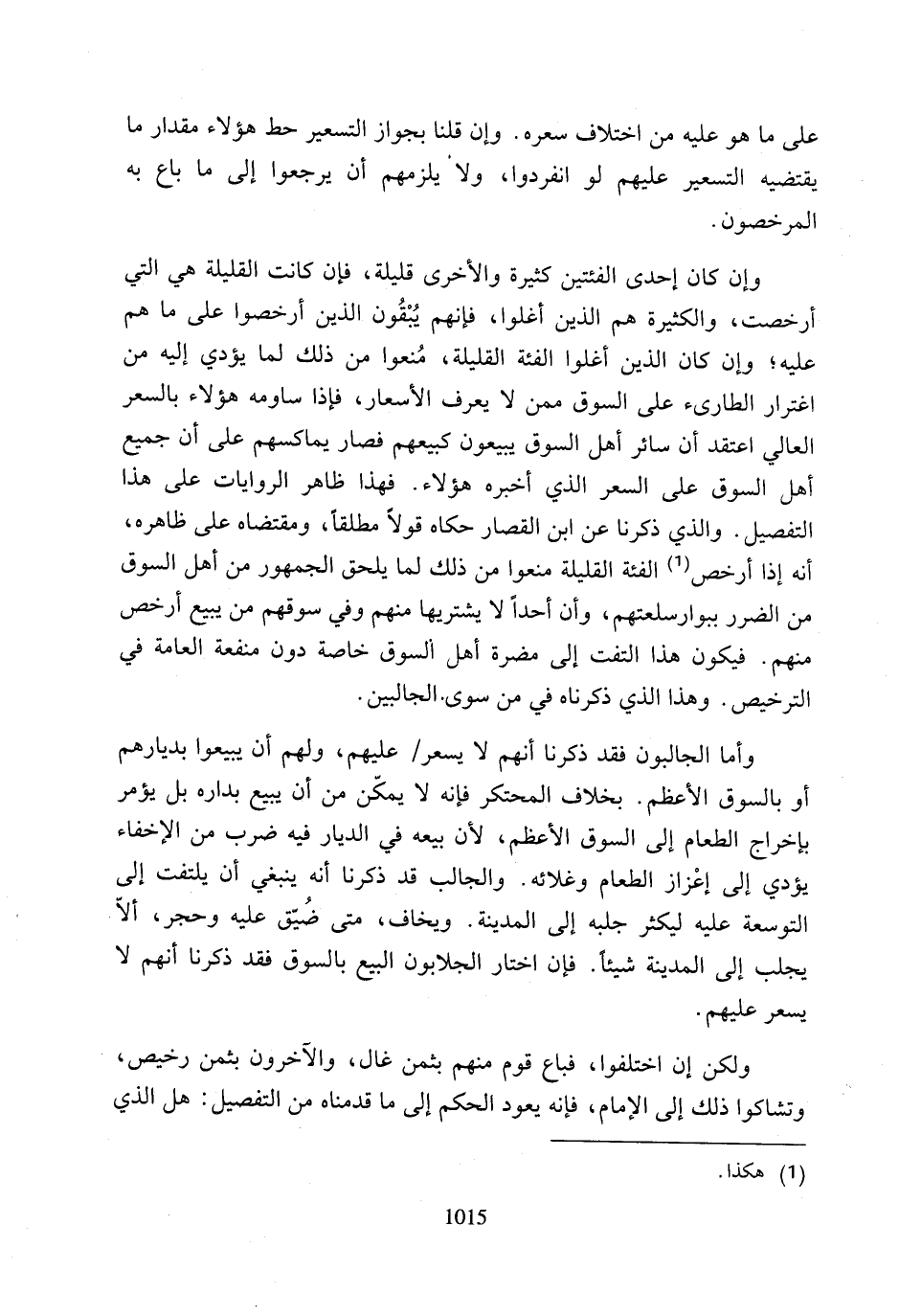 وإن كان إحدى الفئتين كثيرة والأخرى قليلة، فإن كانت القليلة هي التي أرخصت، والكثيرة هم الذين أغلوا، فإنهم يُبْقُون الذين أرخصوا على ما هم عليه؛ وإن كان الذين أغلوا الفئة القليلة، مُنعوا من ذلك لما يؤدي إليه من اغترار الطارئ على السوق ممن لا يعرف الأسعار، فإذا ساومه هؤلاء بالسعر العالي اعتقد أن سائر أهل السوق يبيعون كبيعهم فصار يماكسهم على أن جميع أهل السوق على السعر الذي أخبره هؤلاء. فهذا ظاهر الروايات على هذا التفصيل. والذي ذكرنا عن ابن القصار حكاه قولًا مطلقًا، ومقتضاه على ظاهره، أنه إذا أرخص (¬1) الفئة القليلة منعوا من ذلك لما يلحق الجمهور من أهل السوق من الضرر ببوار سلعتهم، وأن أحدًا لا يشتريها منهم وفي سوقهم من يبيع أرخص منهم. فيكون هذا التفت إلى مضرة أهل السوق خاصة دون منفعة العامة في الترخيص. وهذا الذي ذكرناه في من سوى. الجالبين.