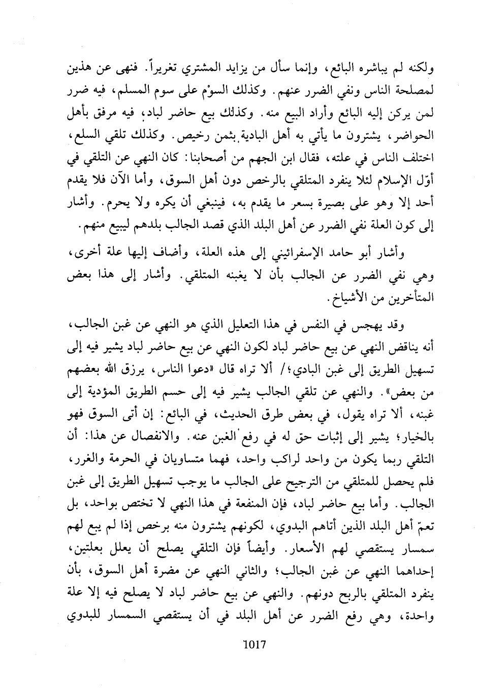 وقد يهجس في النفس في هذا التعليل الذي هو النهي عن غبن الجالب، أنه يناقض النهي عن بيع حاضر لباد لكون النهي عن بيع حاضر لباد يشير فيه إلى تسهيل الطريق إلى غبن البادي؛/ ألا تراه قال "دعوا الناس، يرزق الله بعضهم من بعض". والنهي عن تلقي الجالب يشير فيه إلى حسم الطريق المؤدية إلى غبنه، ألا تراه يقول، في بعض طرق الحديث، في البائع: إن أتى السوق فهو بالخيارة يشير إلى إثبات حق له في رفع. الغبن عنه. والانفصال عن هذا: أن التلقي ربما يكون من واحد لراكب واحد، فهما متساويان في الحرمة والغرر، فلم يحصل للمتلقي من الترجيح على الجالب ما يوجب تسهيل الطريق إلى غبن الجالب. وأما بيع حاضر لباد، فإن المنفعة في هذا النهي لا تختص بواحد، بل تعم أهل البلد الذين أتاهم البدوي، لكونهم يشترون منه برخص إذا لم يبع لهم سمسار يستقصي لهم الأسعار. وأيضًا فإن التلقي يصلح أن يعلل بعلتين، إحداهما النهي عن غبن الجالب؛ والثاني النهي عن مضرة أهل السوق، بأن ينفرد المتلقي بالربح دونهم. والنهي عن بيع حاضر لباد لا يصلح فيه إلا علة واحدة، وهي رفع الضرر عن أهل البلد في أن يستقصي السمسار للبدوي