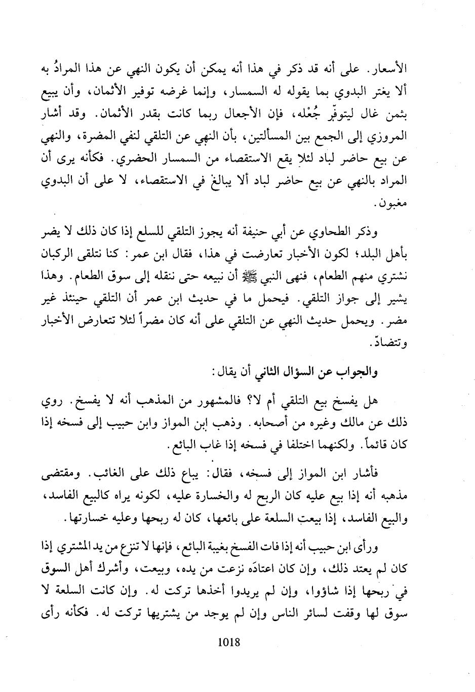 وذكر الطحاوي عن أبي حنيفة أنه يجوز التلقي للسلع إذا كان ذلك لا يضر بأهل البلدة لكون الأخبار تعارضت في هذا، فقال ابن عمر: كنا نتلقى الركبان نشتري منهم الطعام، فنهى النبي - صلى الله عليه وسلم - أن نبيعه حتى ننقله إلى سوق الطعام. وهذا يشير إلى جواز التلقي. فيحمل ما في حديث ابن عمر أن التلقي حينئذ غير مضر. ويحمل حديث النهي عن التلقي على أنه كان مضرًا لئلا تتعارض الأخبار وتتضادّ.