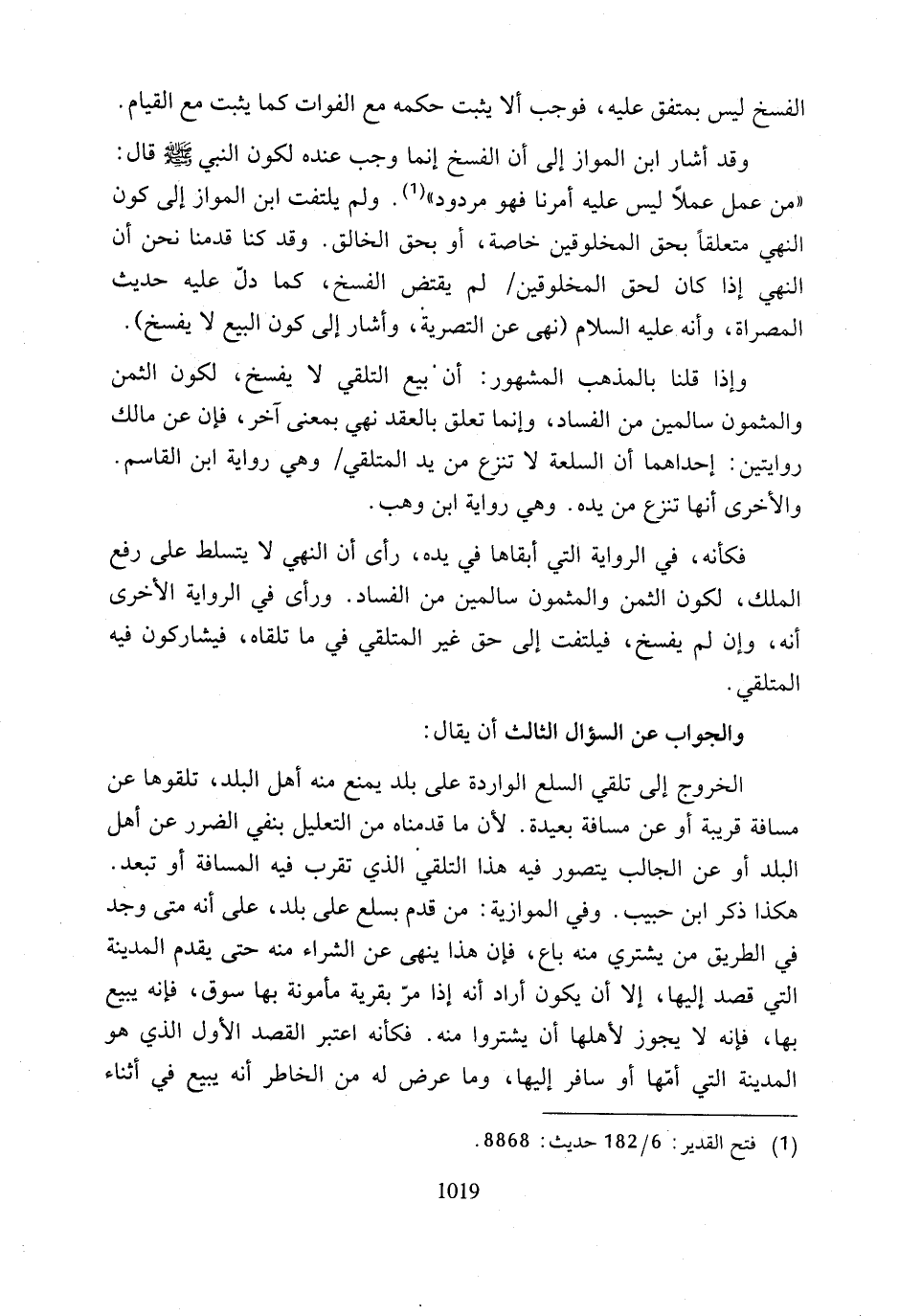 فكأنه، في الرواية التي أبقاها في يده، رأى أن النهي لا يتسلط على رفع الملك، لكون الثمن والمثمون سالمين من الفساد. ورأى في الرواية الأخرى أنه، وإن لم يفسخ، فيلتفت إلى حق غير المتلقي في ما تلقاه، فيشاركون فيه المتلقي.