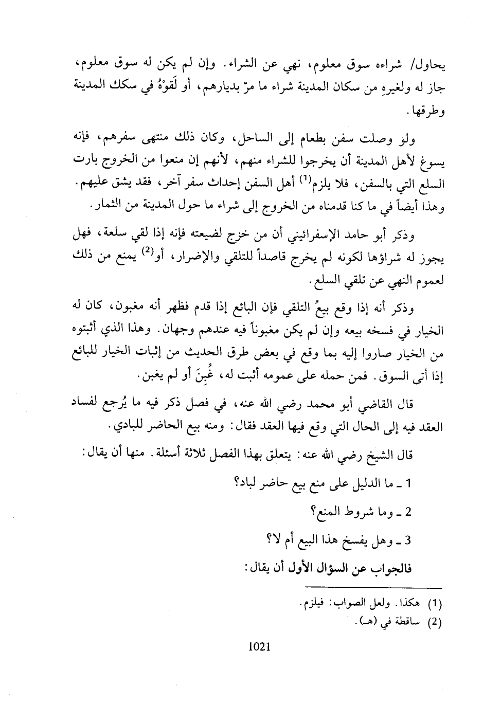 قال القاضي أبو محمَّد رضي الله عنه، في فصل ذكر فيه ما يُرجع لفساد العقد فيه إلى الحال التي وقع فيها العقد فقال: ومنه بيع الحاضر للبادي.