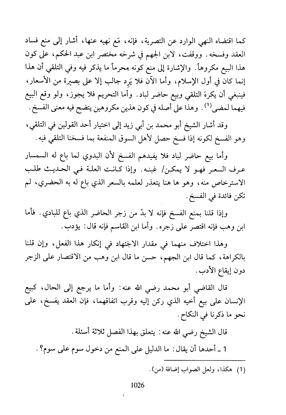 كما اقتضاه النهي الوارد عن التصرية، فإنه، مَع نهيه عنها، أشار إلى منع فساد العقد وفسخه. ووقفت، لابن الجهم في شرخه مختصر ابن عبد الحكم، على كون هذا البيع مكروهًا. والإشارة إلى منع كونه محرمًا ما يذكر فيه وفي التلقي أن هذا إنما كان في أول الإِسلام، وأما الآن فلا يَرِد جالب إلا على بصيرة من الأسعار، فينبغي أن يكرهَ التلقي وبيع حاضر لباد. وأما التحريم فلا يجوز، ولو وقع البيع فيهما لمضى (¬1). وهذا على أصله في كون هذين مكروهين يتضح فيه معنى الفسخ.