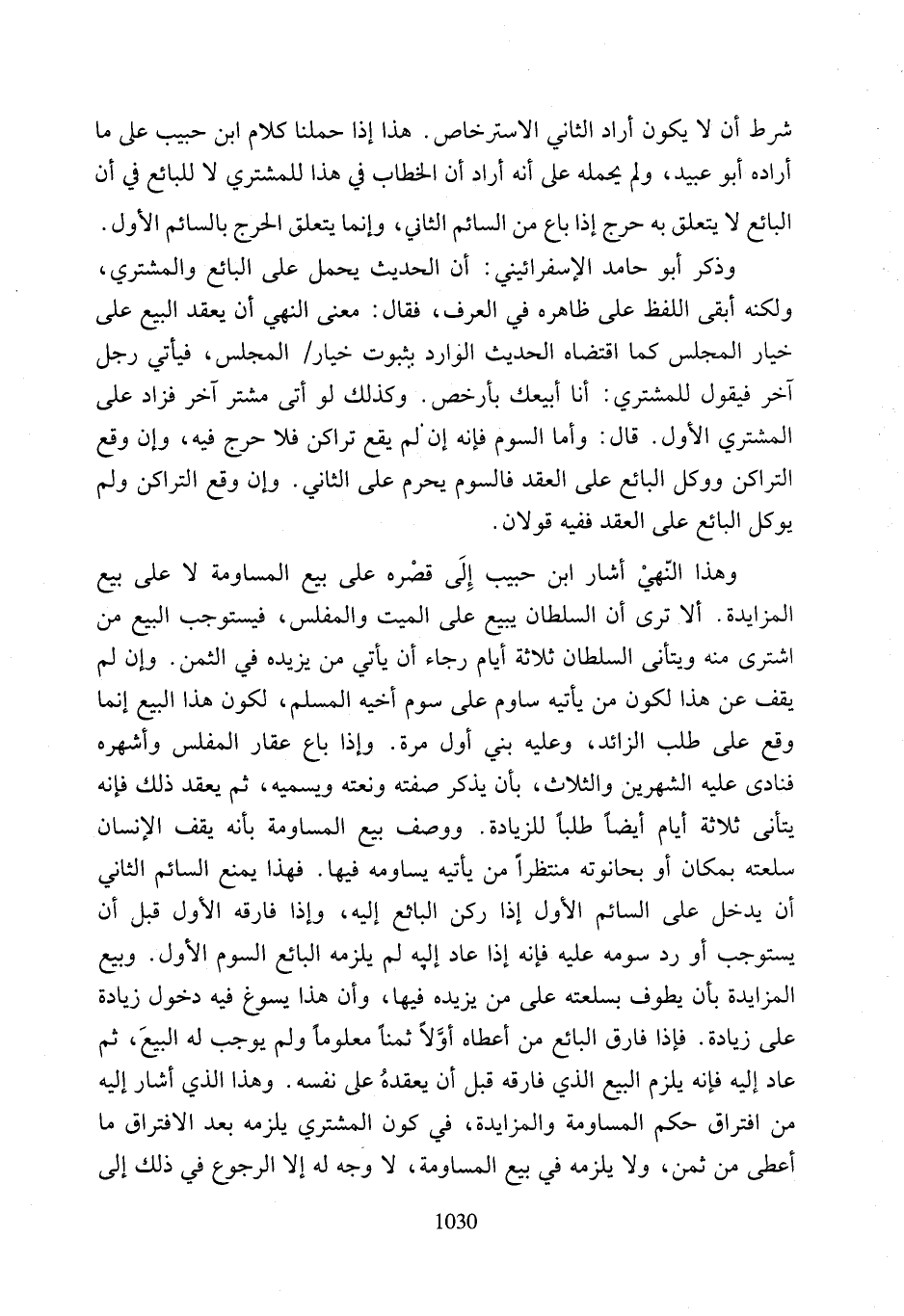 وهذا النّهيْ أشار ابن حبيب إِلَى قصْره على بيع المساومة لا على بيع المزايدة. ألا ترى أن السلطان يبيع على الميت والمفلس، فيستوجب البيع من اشترى منه ويتأنى السلطان ثلاثة أيام رجاء أن يأتي من يزيده في الثمن. وإن لم يقف عن هذا لكون من يأتيه ساوم على سوم أخيه المسلم، لكون هذا البيع إنما وقع على طلب الزائد، وعليه بني أول مرة. وإذا باع عقار المفلس وأشهره فنادى عليه الشهرين والثلاث، بأن يذكر صفته ونعته ويسميه، ثم يعقد ذلك فإنه يتأنى ثلاثة أيام أيضًا طلبًا للزيادة. ووصف بيع المساومة بأنه يقف الإنسان سلعته بمكان أو بحانوته منتظرًا من يأتيه يساومه فيها. فهذا يمنع السائم الثاني أن يدخل على السائم الأول إذا ركن البائع إليه، وإذا فأرقه الأول قبل أن يستوجب أو رد سومه عليه فإنه إذا عاد إليه لم يلزمه البائع السوم الأول. وبيع المزايدة بأن يطوف بسلعته على من يزيده فيها، وأن هذا يسوغ فيه دخول زيادة على زيادة. فإذا فارق البائع من أعطاه أوَلًا ثمنًا معلومأولم يوجب له البيعَ، ثم عاد إليه فإنه يلزم البيع الذي فأرقه قبل أن يعقدهُ على نفسه. وهذا الذي أشار إليه من افتراق حكم المساومة والمزايدة، في كون المشتري يلزمه بعد الافتراق ما أعطى من ثمن، ولا يلزمه في بيع المساومة، لا وجه له إلا الرجوع في ذلك إلى