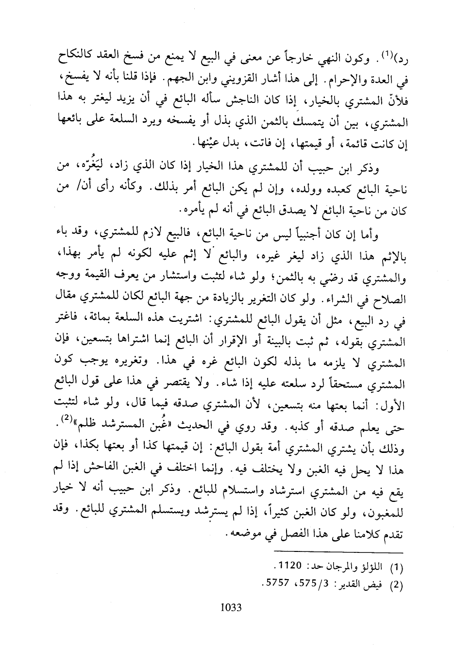 رد) (¬1). وكون النهي خارجًا عن معنى في البيع لا يمنع من فسخ العقد كالنكاح في العدة والإحرام. إلى هذا أشار القزويني وابن الجهم. فإذا قلنا بأنه لا يفسخ، فلأنّ المشتري بالخيار، إذا كان الناجش سأله البائع في أن يزيد ليعرّ به هذا المشتري، بين أن يتمسكَ بالثمن الذي بذل أو يفسخه ويرد السلعة على بائعها إن كانت قائمة، أو قيمتها، إن فاتت، بدل عيْنها.