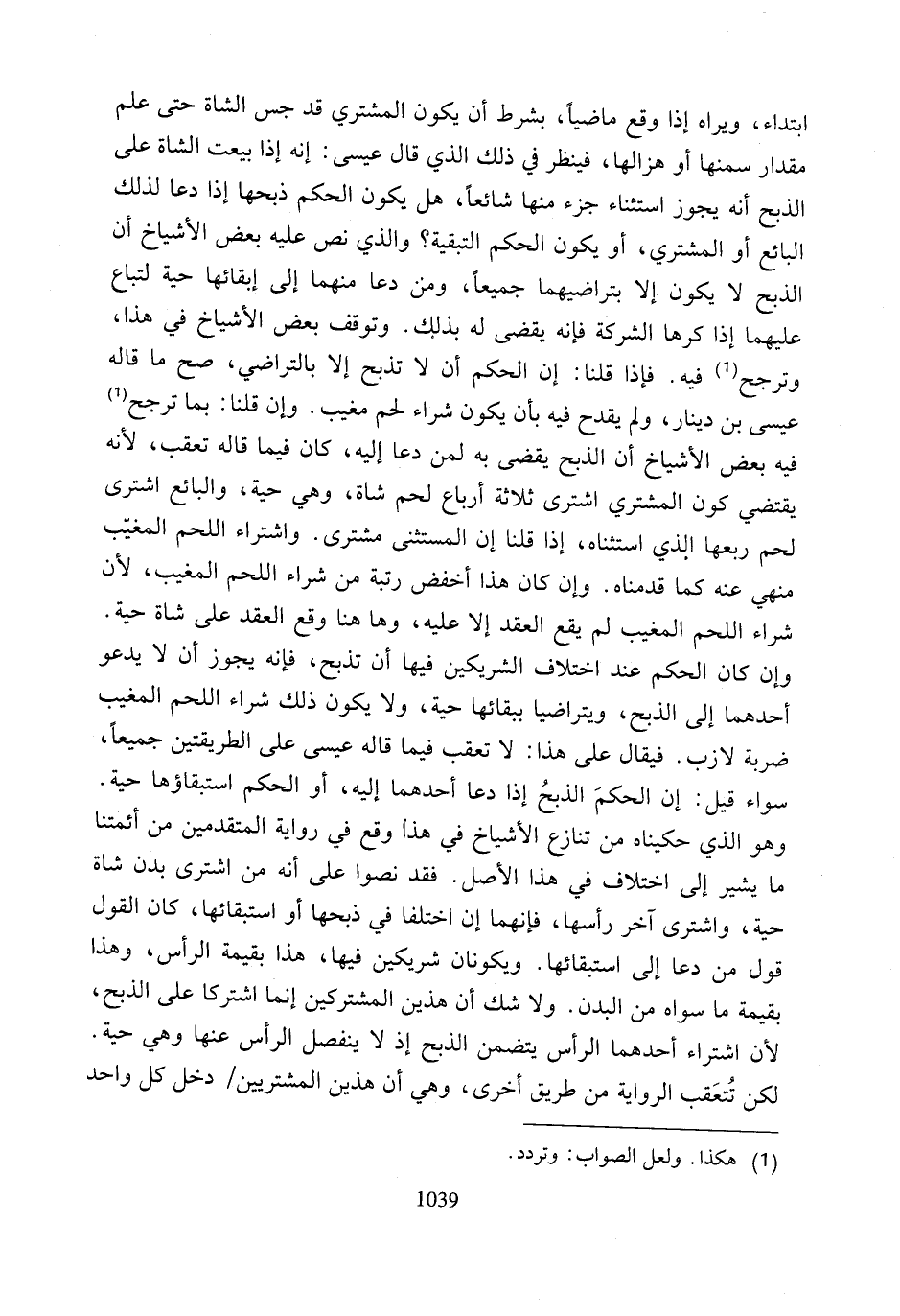 وإن كان الحكم عند اختلاف الشريكين فيها أن تذبح، فإنه يجوز أن لا يدعو أحدهما إلى الذبح، ويتراضيا ببقائها حية، ولا يكون ذلك شراء اللحم المغيب ضربة لازب. فيقال على هذا: لا تعقب فيما قاله عيسى على الطريقتين جميعًا، سواء قيل: إن الحكمَ الذبحُ إذا دعا أحدهما إليه، أو الحكم استبقاؤها حية.
