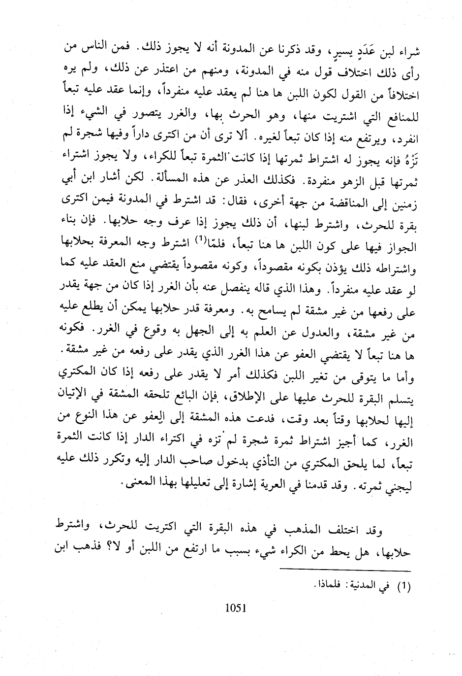 شراء لبن عَدَدٍ يسيرٍ، وقد ذكرنا عن المدونة أنه لا يجوز ذلك. فمن الناس من رأى ذلك اختلاف قول منه في المدونة، ومنهم من اعتذر عن ذلك، ولم يره اختلافًا من القول لكون اللبن ها هنا لم يعقد عليه منفردًا، وإنما عقد عليه تبعًا للمنافع التي اشتريت منها، وهو الحرث بها، والغرر يتصور في الشيء إذا انفرد، ويرتفع منه إذا كان تبعًا لغيره. ألا ترى أن من اكترى دارًا وفيها شجرة لم تَزْهُ فإنه يجوز له اشتراط ثمرتها إذا كانت. الثمرة تبعًا للكراء، ولا يجوز اشتراء ثمرتها قبل الزهو منفردة. فكذلك العذر عن هذه المسألة. لكن أشار ابن أبي زمنين إلى المناقضة من جهة أخرى، فقال: قد اشترط في المدونة فيمن اكترى بقرة للحرث، واشترط لبنها، أن ذلك يجوز إذا عرف وجه حلابها. فإن بناء الجواز فيها على كون اللبن ها هنا تبعًا، فلمّا (¬1) اشترط وجه المعرفة بحلابها واشتراطه ذلك يؤذن بكونه مقصودًا، وكونه مقصودًا يقتضي منع العقد عليه كما لو عقد عليه منفردًا. وهذا الذي قاله ينفصل عنه بأن الغرر إذا كان من جهة يقدر على رفعها من غير مشقة لم يسامح به. ومعرفة قدر حلابها يمكن أن يطلع عليه من غير مشقة، والعدول عن العلم به إلى الجهل به وقوع في الغرر. فكونه ها هنا تبعًا لا يقتضي العفو عن هذا الغرر الذي يقدر على رفعه من غير مشقة.