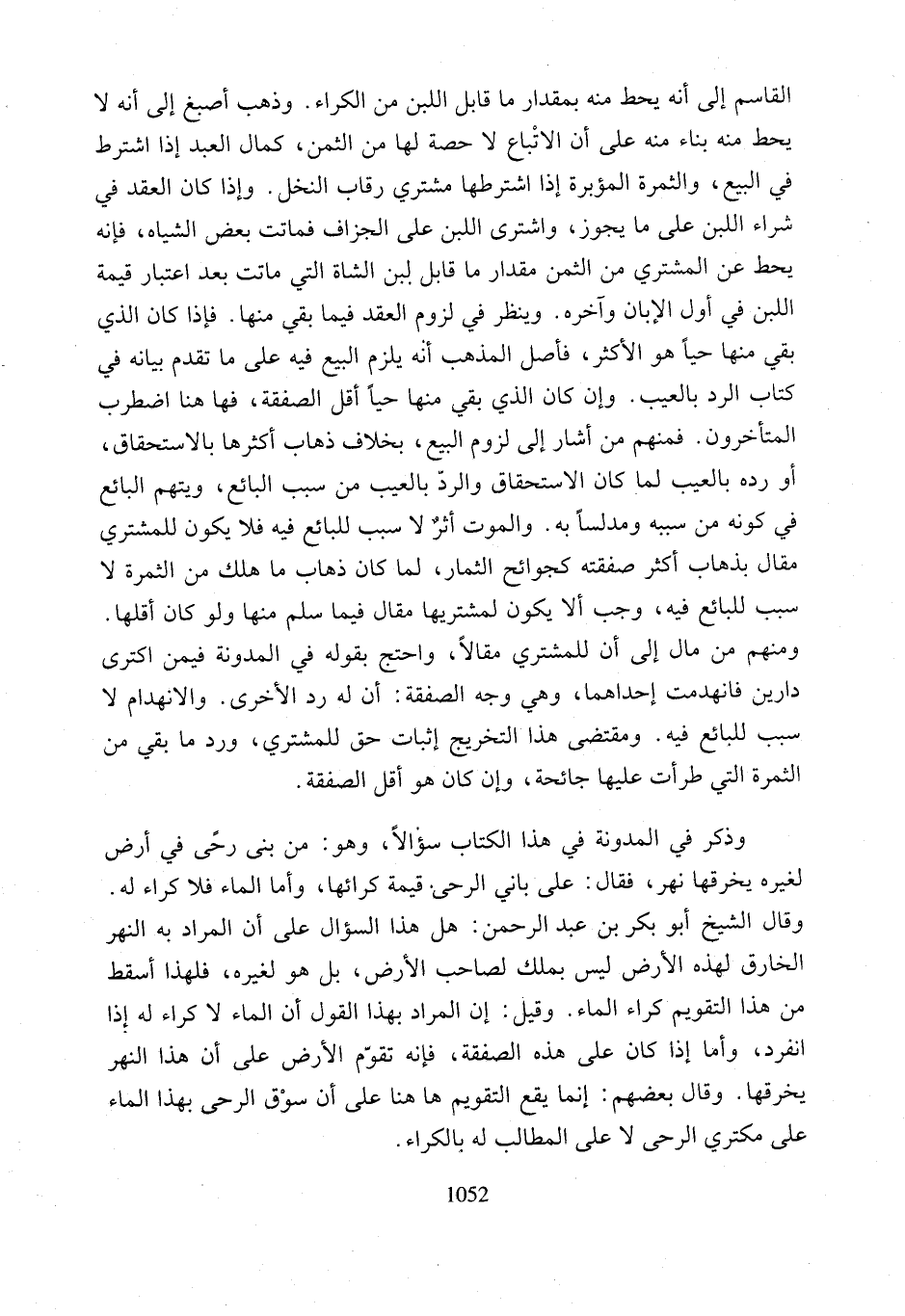 القاسم إلى أنه يحط منه بمقدار ما قابل اللبن من الكراء. وذهب أصبغ إلى أنه لا يحط منه بناء منه على أن الاتباع لا حصة لها من الثمن، كمال العبد إذا اشترط في البيع، والثمرة المؤبرة إذا اشترطها مشتري رقاب النخل. وإذا كان العقد في شراء اللبن علي ما يجوز، واشترى اللبن علي الجزاف فماتت بعض الشياه، فإنه يحط عن المشتري من الثمن مقدار ما قابل لبن الشاة التي ماتت بعد أعتبار قيمة اللبن في أول الإبان وآخره. وينظر في لزوبم العقد فيما بقي منها. فإذا كان الذي بقي منها حيًا هو الأكثر، فأصل المذهب أنه يلزم البيع فيه على ما تقدم بيانه في كتاب الرد بالعيب. وإن كان الذي بقي منها حيًا أقل الصفقة، فها هنا اضطرب المتأخرون. فمنهم من أشار إلى لزوم البيع، بخلاف ذهاب أكثرها بالاستحقاق، أو رده بالعيب لما كان الاستحقاق والردّ بالعيب من سبب البائع، ويتهم البائع في كونه من سببه ومدلسًا به. والموت أثرٌ لا سبب للبائع فيه فلا يكون للمشتري مقال بذهاب أكثر صفقته كجوائح الثمار، لما كان ذهاب ما هلك من الثمرة لا سبب للبائع فيه، وجب ألا يكون لمشتريها مقال فيما سلم منها ولو كان أقلها.