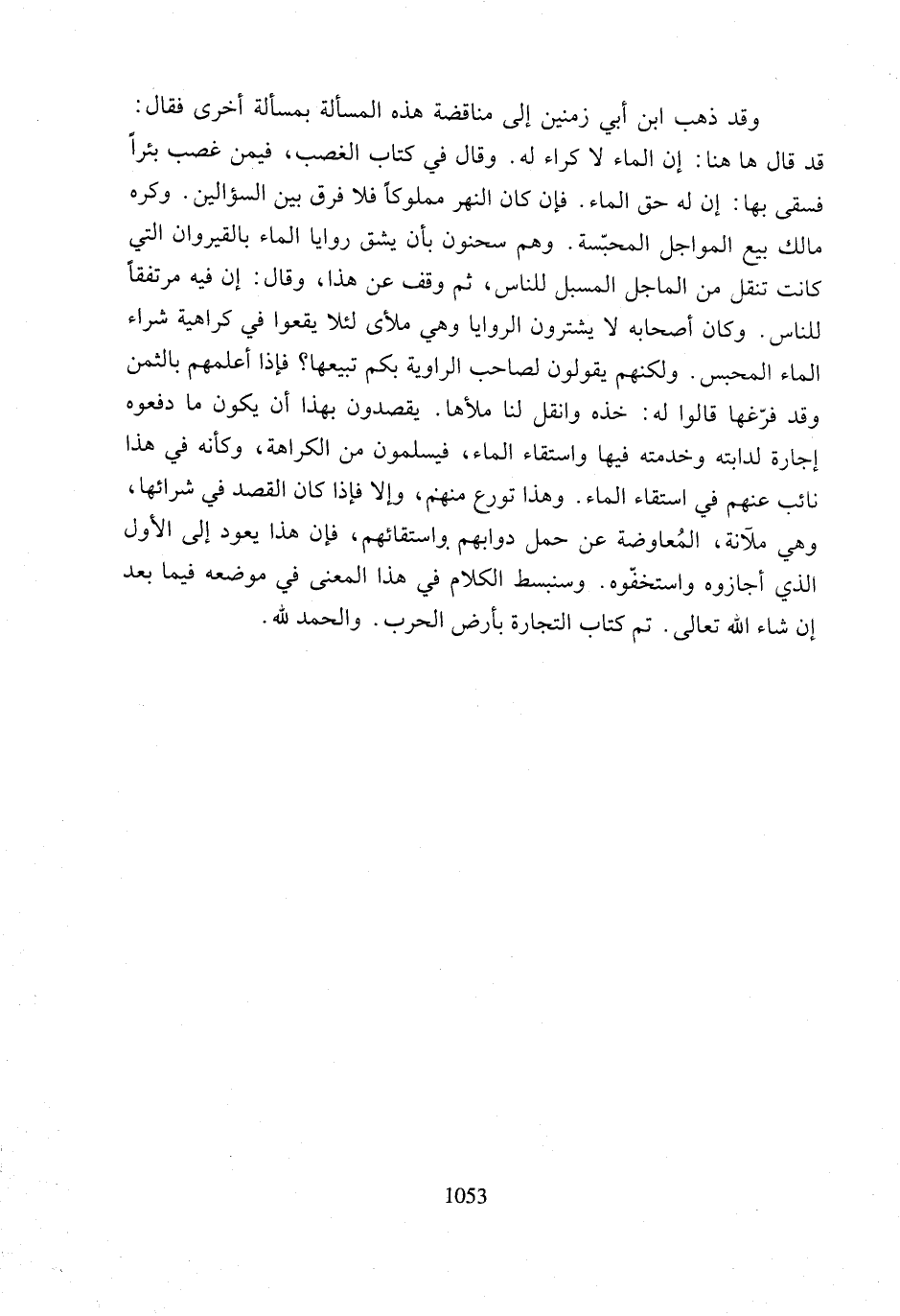 وقد ذهب ابن أبي زمنين إلى مناقضة هذه المسألة بمسألة أخرى فقال: قد قال ها هنا: إن الماء لا كراء له. وقال في كتاب الغصب، فيمن غصب بئرًا فسقى بها: إن له حق الماء. فإن كان النهر مملوكًا فلا فرق بين السؤالين. وكره مالك بيع المواجل المحبّسة. وهم سحنون بأن يشق روايا الماء بالقيروان التي كانت تنقل من الماجل المسبل للناس، ثم وقف عن هذا، وقال: إن فيه مرتفقًا للناس. وكان أصحابه لا يشترون الروايا وهي ملأى لئلا يقعوا في كراهية شراء الماء المحبس. ولكنهم يقولون لصاحب الراوية بكم تبيعها؟ فإذا أعلمهم بالثمن وقد فرّغها قالوا له: خذه وانقل لنا ملأها. يقصدون بهذا أن يكون ما دفعوه إجارة لدابته وخدمته فيها واستقاء الماء، فيسلمون من الكراهة، وكأنه في هذا نائب عنهم في استقاء الماء. وهذا تورع منهم، وإلا فإذا كان القصد في شرائها، وهي ملآنة، المُعاوضة عن حمل دوابهم واستقائهم، فإن هذا يعود إلى الأول الذي أجازوه واستخفّوه.