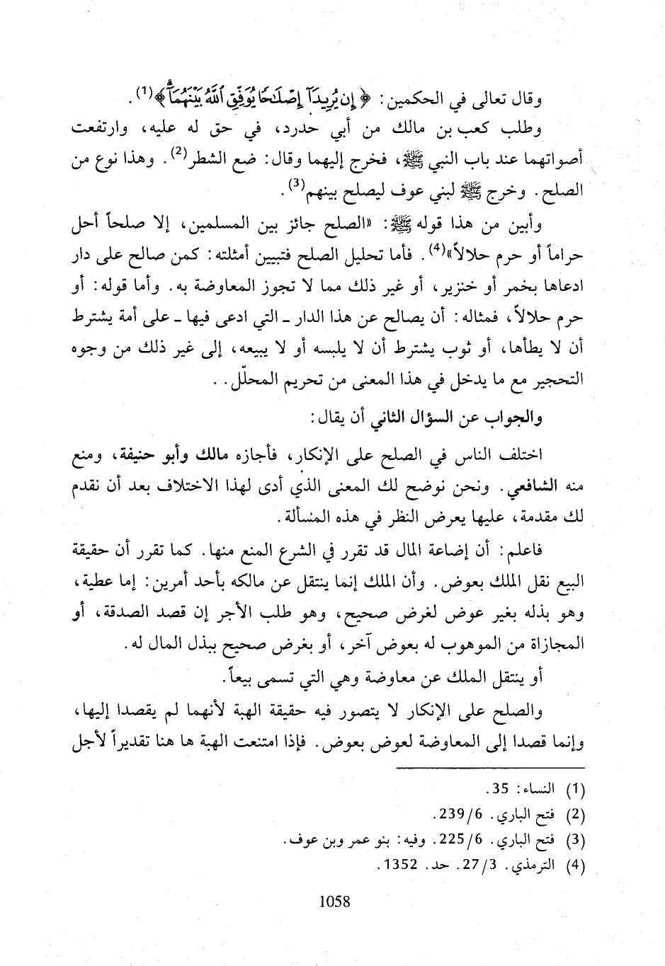 وأبين من هذا قوله - صلى الله عليه وسلم -: "الصلح جائز بين المسلمين، الأصلحًا أحل حرامًا أو حرم حلالًا" (¬4). فأما تحليل الصلح فتبيين أمثلته: كمن صالح على دار ادعاها بخمر أو خنزير، أو غير ذلك مما لا تجوز المعاوضة به. وأما قوله: أو حرم حلالًا، فمثاله: أن يصالح عن هذا الدار -التي ادعى فيها- على أمة يشترط أن لا يطأها، أو ثوب يشترط أن لا يلبسه أو لا يبيعه، إلى غير ذلك من وجوه التحجير مع ما يدخل في هذا المعنى من تحريم المحلّل ..