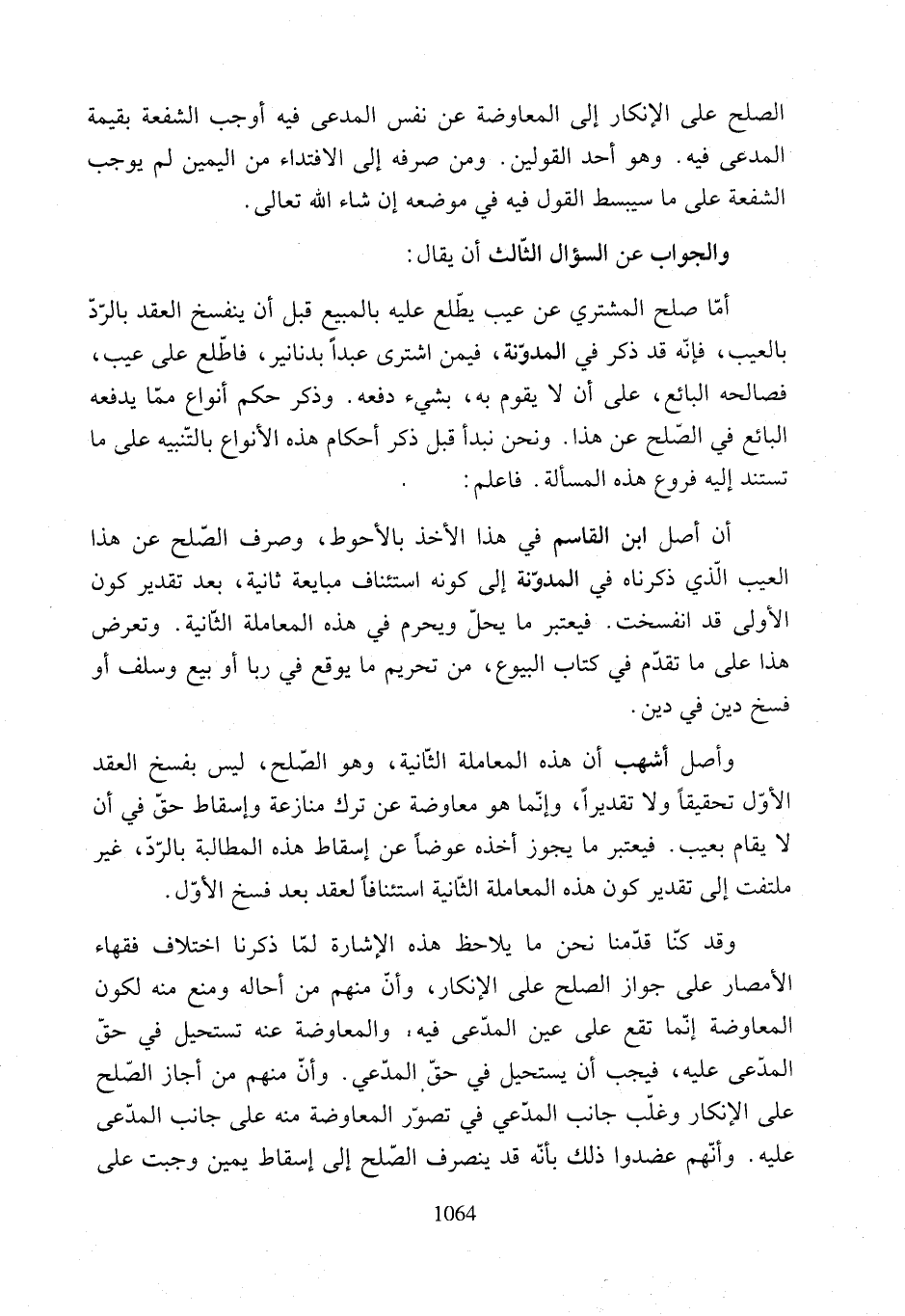 أن أصل ابن القاسم في هذا الأخذ بالأحوط، وصرف الصلح عن هذا العيب الّذي ذكرناه في المدوّنة إلى كونه استئناف مبايعة ثانية، بعد تقدير كون الأولى قد انفسخت. فيعتبر ما يحلّ ويحرم في هذه المعاملة الثانية. وتعرض هذا على ما تقدّم في كتاب البيوع، من تحريم ما يوقع في ربا أو بيع وسلف أو فسخ دين في دين. وأصل أشهب أن هذه المعاملة الثّانية، وهو الصّلح، ليس بفسخ العقد الأوّل تحقيقًا ولا تقديرًا، وإنّما هو معاوضة عن ترك منازعة وإسقاط حقّ في أن لا يقام بعيب. فيعتبر ما يجوز أخذه عوضًا عن إسقاط هذه المطالبة بالرّدّ، غير ملتفت إلى تقدير كون هذه المعاملة الثّانية استئنافًا لعقد بعد فسخ الأوّل.
