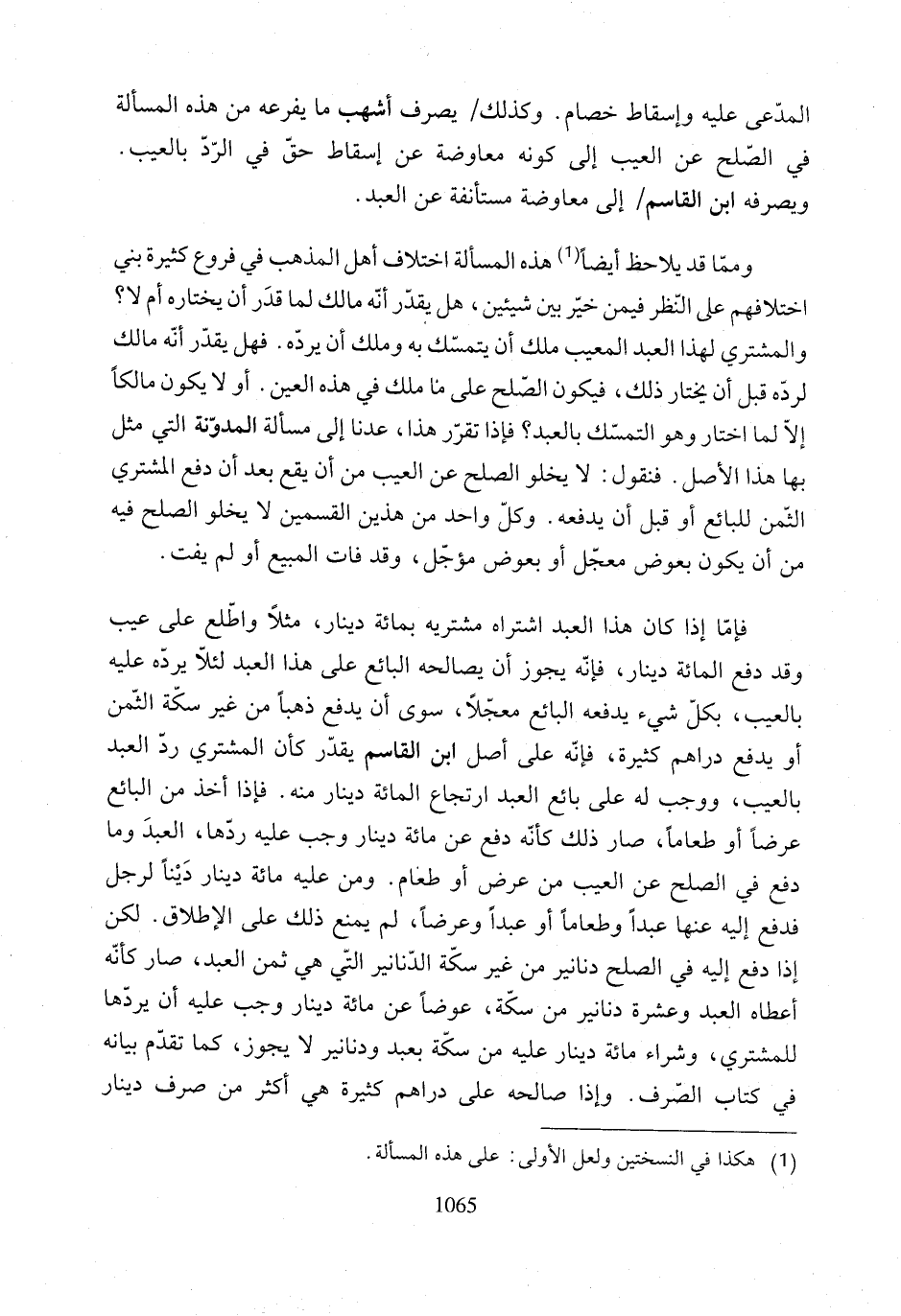 فإمّا إذا كان هذا العبد اشتراه مشتريه بمائة دينار، مثلًا واطّلع على عيب وقد دفع المائة دينار، فإنّه يجوز أن يصالحه البائع على هذا العبد لئلاّ يردّه عليه بالعيب، بكلّ شيء يدفعه البائع معجّلًا، سوى أن يدفع ذهبًا من غير سكّة الثّمن أو يدفع دراهم كثيرة، فإنّه على أصل ابن القاسم يقدّر كأن المشتري ردّ العبد بالعيب، ووجب له على بائع العبد ارتجاع المائة دينار منه. فإذا أخذ من البائع عرضًا أو طعامًا، صار ذلك كأنّه دفع عن مائة دينار وجب عليه ردّها، العبدَ وما دفر في الصلح عن العيب من عرض أو طعام. ومن عليه مائة دينار دَيْنًا لرجل فدفع إليه عنها عبدًا وطعامًا أو عبدًا وعرضًا، لم يمنع ذلك على الإطلاق. لكن إذا دفع إليه في الصلح دنانير من غير سكّة الدّنانير التّي هي ثمن العبد، صار كأنّه أعطاه العبد وعشرة دنانير من سكّة، عوضًا عن مائة دينار وجب عليه أن يردّها للمشتري، وشراء مائة دينار عليه من سكة بعبد ودنانير لا يجوز، كما تقدّم بيانه في كتاب الصّرف. وإذا صالحه على دراهم كثيرة هي أكثر من صرف دينار
