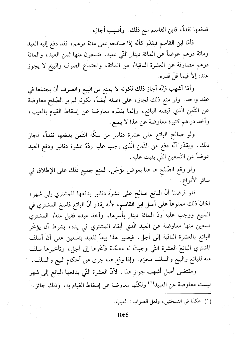 فلو فرضنا أنّ البائع صالح على عشرة دنانير يدفعها للمشتري إلى شهر، لكان ذلك ممنوعًا على أصل ابن القاسم، لأنّه يقدر أنّ البائع فاسخ المشتري في المبيع ووجب عليه ردّ المائة دينار بأسرها، وأخذ عبده فقبل منه المشتري تسعين منها معاوضة عن العبد الذي أبقاه المشتري في يده، بشرط أن يؤخّر البائع بالعشرة الباقية إلى أجل. فيصير هذا بيعًا للعبد بتسعين على أن أسلف المشتري البائعَ العشرة التّي وجبتْ له معجّلة فأخرها إلى أجل، وتأخيرها سلف منه للبائع والبيع والسلف محرّم. وإذا وقع هذا جرى على أحكام البيع والسلف.