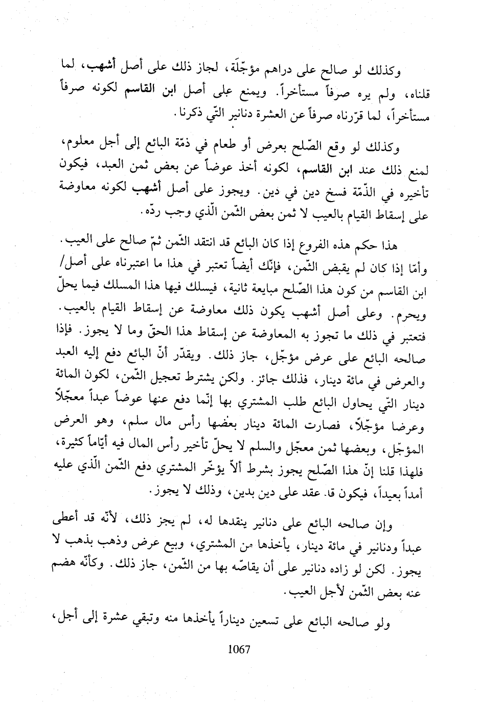فتعتبر في ذلك ما تجوز به المعاوضة عن إسقاط هذا الحقّ وما لا يجوز. فإذا صالحه البائع على عرض مؤجّل، جاز ذلك. ويقدّر أنّ البائع دفع إليه العبد والعرض في مائة دينار، فذلك جائز. ولكن يشترط تعجيل الثّمن، لكون المائة دينار التّي يحاول البائع طلب المشتري بها إنّما دفع عنها عوضًا عبدًا معجّلًا وعرضا مؤجّلًا، فصارت المائة دينار بعضها رأس مال سلم، وهو العرض المؤجّل، وبعضها ثمن معجّل والسلم لا يحلّ تأخير رأس المال فيه أيّامًا كثيرة، فلهذا قلنا إنّ هذا الصّلح يجوز بشرط ألاّ يؤخّر المشتري دفع الثمن الّذي عليه أمدًا بعيدًا، فيكون قا، عقد على دين بدين، وذلك لا يجوز.