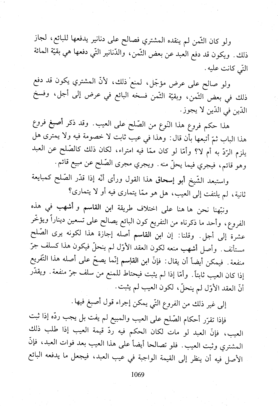 ونبّهنا نحن ها هنا على اختلاف طريقة ابن القاسم وأشهب في هذه الفروع، واحد ما ذكرناه من التفريع كون البائع يصالح على تسعين دينارًا ويؤخر عشرة إلى أجل. وقلنا: إن ابن القاسم أصله إجازة هذا لكونه يرى الصّلح مستأنف. وأصل أشهب منعه لكون العقد الأوّل لم ينحل فيكون هذا كسلف جرّ منفعة. فيمكن أيضًا أن يقال: فإن ابن القاسم إنّما يصح على أصله هذا التّفريع إذا كان العيب ثابتًا. وأمّا إذا لم يثبت فيحتاط للمنع من سلف جرّ منفعة. ويقدّر أنّ العقد الأوّل لم ينحلّ، لكون العيب لم يثبت.