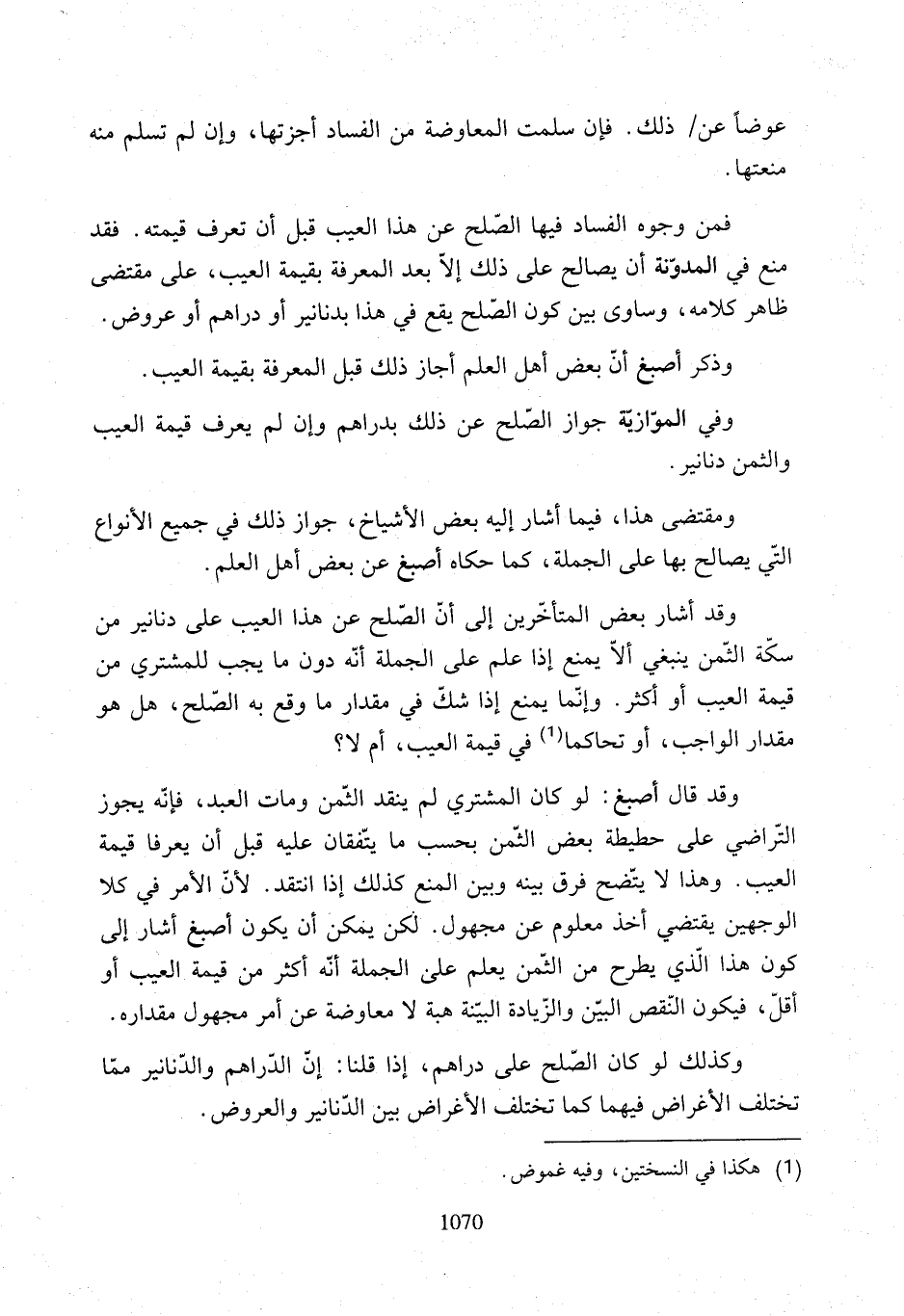 عوضًا عن ذلك. فإن سلمت المعاوضة من الفساد أجزتها، وإن لم تسلم منه فمن وجوه الفساد فيها الصّلح عن هذا العيب قبل أن تعرف قيمته. فقد منع في المدوّنة أن يصالح على ذلك إلاّ بعد المعرفة بقيمة العيب، على مقتضى ظاهر كلامه، وساوى بين كون الصّلح يقع في هذا بدنانير أو دراهم أو عروض.