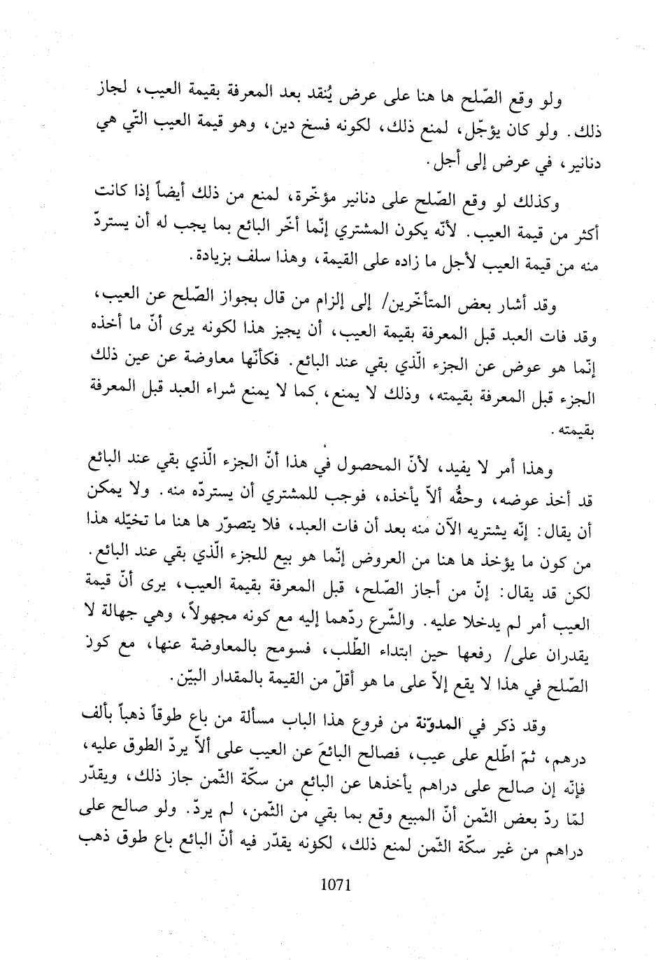 ولو وقع الصّلح ها هنا على عرض يُنقد بعد المعرفة بقيمة العيب، لجاز ذلك. ولو كان يؤجّل، لمنع ذلك، لكونه فسخ دين، وهو قيمة العيب التّي هي دنانير، في عرض إلى أجل.