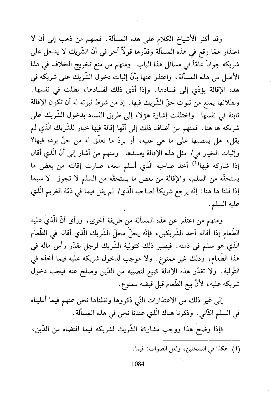 وقد أكثر الأشياخ الكلام على هذه المسألة. فمنهم من ذهب إلى أن لا اعتذار عما وقع في هذه المسألة وقدّرها قولًا آخر في أن الشّريك لا يدخل على شريكه جوابًا عامّا في مسائل هذا الباب. ومنهم من منع تخريج الخلاف في هذا الأصل من هذه المسألة، واعتذر عنها بأنّ إثبات دخول الشّريك على شريكه في هذه الإقالة يؤدي إلى فسادها. وإذا ادّى ذلك لفسادها، بطلت في نفسها.