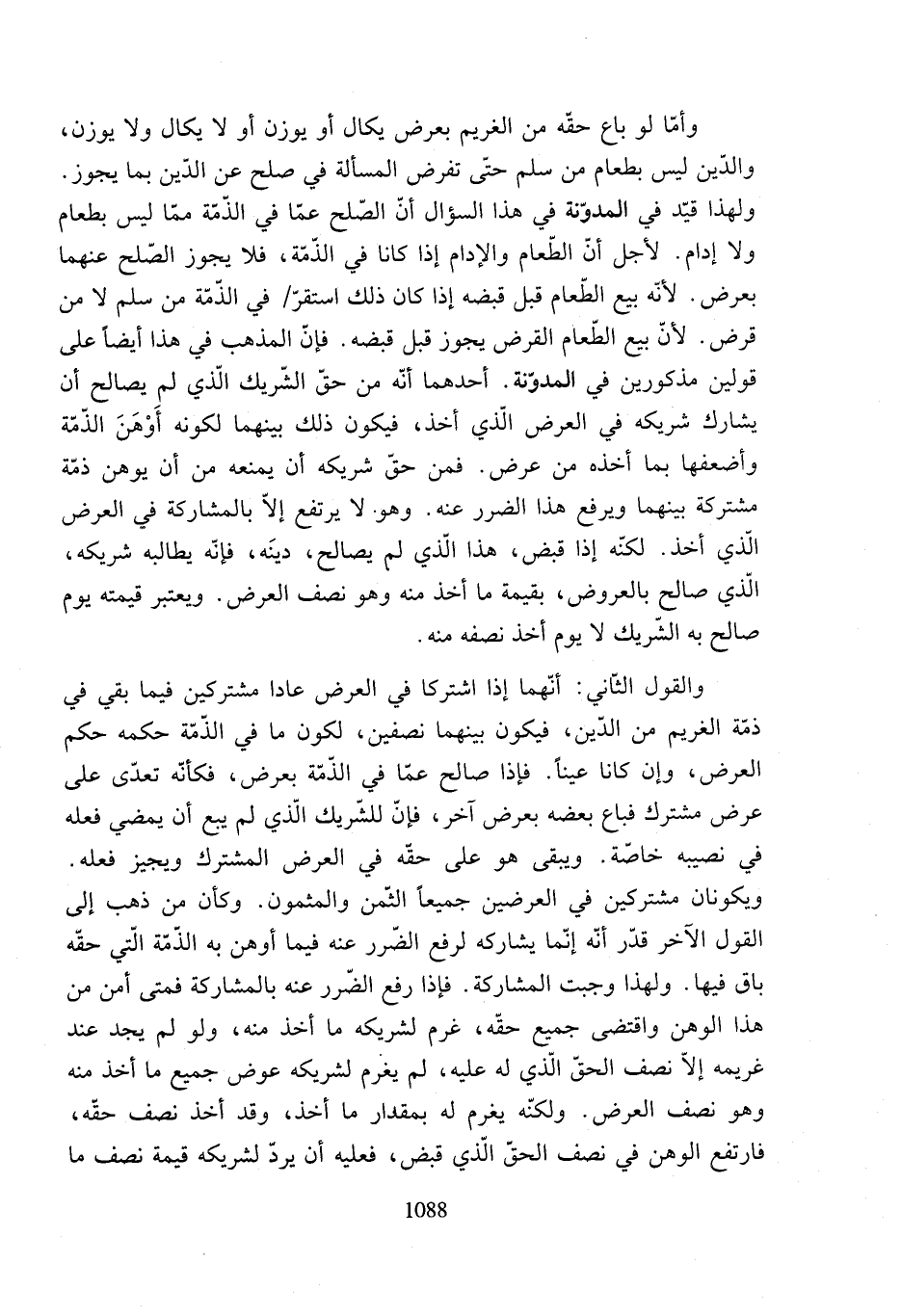 ولهذا قيّد في المدوّنة في هذا السؤال أن الصّلح عمّا في الذّمّة مِمّا ليس بطعام ولا إدام. لأجل أن الطّعام والإدام إذا كانا في الذمة، فلا يجوز الصّلح عنهما بعرض. لأنه بيع الطّعام قبل قبضه إذا كان ذلك استقرّ في النمّة من سلم لا من قرض. لأن بيع الطّعام القرض يجوز قبل قبضه. فإن المذهب في هذا أيضًا على قولين مذكررين في المدوّنة. أحدهما أنّه من حقّ الشّريك الّذي لم يصالح أن يشارك شريكه في العرض الذي أخذ، فيكون ذلك بينهما لكونه أَوْهَنَ الذّمّة وأضعفها بما أخذه من عرض. فمن حقّ شريكه أن يمنعه من أن يوهن ذمّة مشتركة بينهما ويرفع هذا الضرر عنه. وهو. لا يرتفع إلاّ بالمشاركة في العرض الّذي أخذ لكنّه إذا قبض، هذا الذي لم يصالح، دينَه، فإنّه يطالبه شريكه، الّذي صالح بالعروض، بقيمة ما أخذ منه وهو نصف العرض. ويعتبر قيمته يوم صالح به الشّريك لا يوم أخذ نصفه منه.