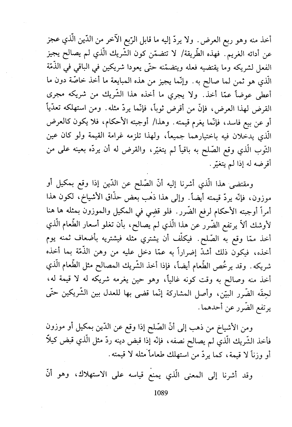 ومقتضى هذا الّذي أشرنا إليه أنّ الصّلح عن الدّين إذا وقع بمكيل أو موزون، فإنّه يردّ قيمته أيضًا. وإلى هذا ذهب بعض حذّاق الأشياخ، لكون هذا أمرًا أوجبته الأحكام لرفع الضّرر. فلو قضِي في المكيل والموزون بمثله ها هنا لأوشك ألاّ يرتفع الضّرر عن هذا الّذي لم يصالح، بأن تغلو أسعار الطّعام الّذي أخذ مِمّا وقع به الصّلح. فيكلّف أن يشتري مثله فيشتريه بأضعاف ثمنه يوم أخذه، فيكون ذلك أشدّ إضرارًا به عمّا دخل عليه من وهن الذمة بما أخذه شريكه. وقد يرخُص الطّعام أيضًا، فإذا أخذ الشّريك المصالح مثل الطعام الّذي أخذ منه وصالح به وقت كونه غاليًا، وهو حين يغرمه شريكه له لا قيمة له، لحِقَه الضّرر البيّن، وأصل المشاركة إنّما قضى بها للعدل بين الشريكين حتّى يرتفع الضّرر عن أحدهما.