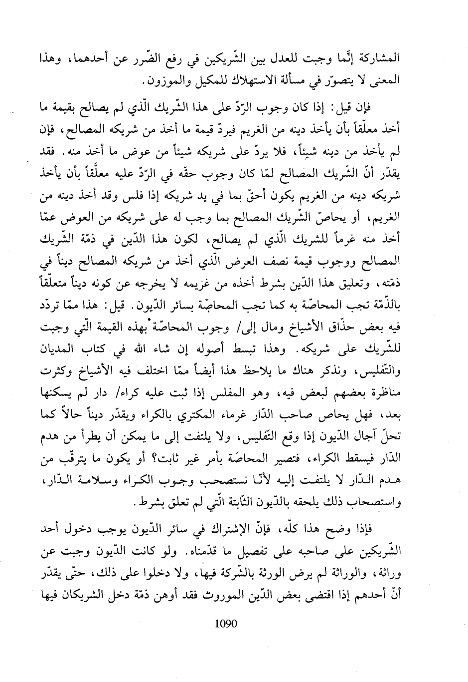 فإذا وضح هذا كلّه، فإنّ الإشتراك في سائر الدّيون يوجب دخول أحد الشّريكين على صاحبه على تفصيل ما قدّمناه. ولو كانت الدّيون وجبت عن وراثة، والوراثة لم يرض الورثة بالشّركة فيها, ولا دخلوا على ذلك، حتى يقدر أن أحدهم إذا اقتضى بعض الدّين المورود فقد أوهن ذمّة دخل الشريكان فيها