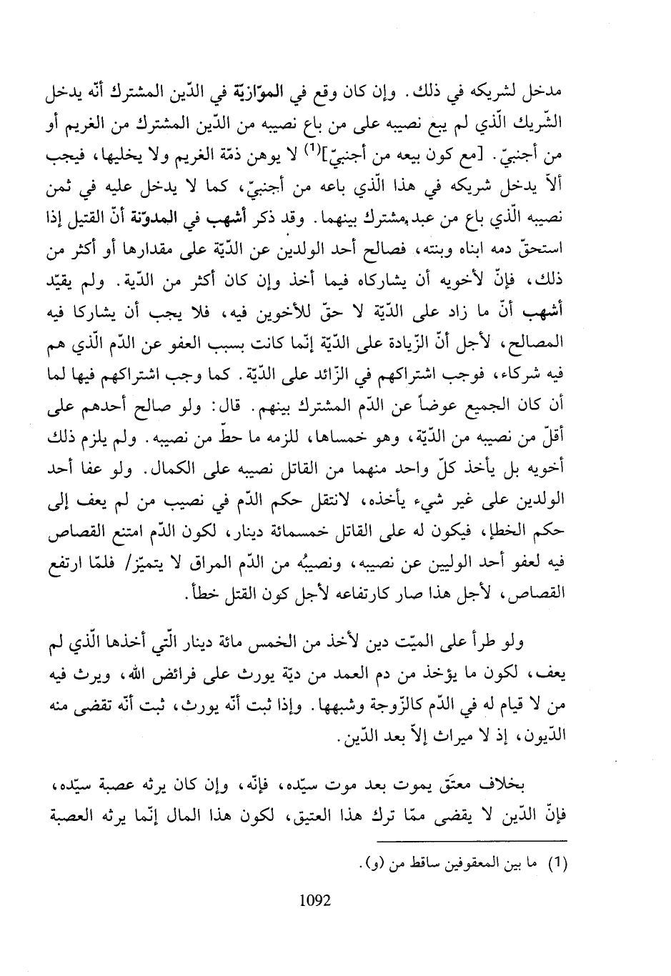 مدخل لشريكه في ذلك. وإن كان وقع في الموّازيّة في الدّين المشترك أنّه يدخل الشّريك الّذي لم يغ نصيبه على من باع نصيبه من الدّين المشترك من الغريم أو من أجنبيّ. [مع كون بيعه من أجنبى] (¬1) لا يوهن ذمّة الغريم ولا يخليها، فيجب ألاّ يدخل شريكه في هذا الّذي باعه من أجنبيّ، كما لا يدخل عليه في ثمن نصيبه الّذي باع من عبد مشترك بينهما. وقد ذكر أشهب في المدوّنة أنّ القتيل إذا استحقّ دمه ابناه وبنته، فصالح أحد الولدين عن الدّيّة على مقدارها أو أكثر من ذلك، فإن لأخويه أن يشاركاه فيما أخذ وإن كان أكثر من الدّية. ولم يقيّد أشهب أنّ ما زاد على الدّيّة لا حق للأخوين فيه، فلا يجب أن يشاركا فيه المصالح، لأجل أن الزيادة على الدّيّة إنّما كانت بسبب العفو عن الدّم الّذي هم فيه شركاء، فوجب اشتراكهم في الزّائد على الدّيّة. كما وجب اشتراكهم فيها لما أن كان الجميع عوضًا عن الدّم المشترك بينهم. قال: ولو صالح أحدهم على أقلّ من نصيبه من الدّيّة، وهو خمساها, للزمه ما حطّ من نصيبه. ولم يلزم ذلك أخويه بل يأخذ كلّ واحد منهما من القاتل نصيبه على الكمال. ولو عما أحد الولدين على غير شيء يأخذه، لانتقل حكم الدّم في نصيب من لم يعف إلى حكم الخطإ، فيكون له على القاتل خمسمائة دينار، لكون الدّم امتنع القصاص فيه لعفو أحد الوليين عن نصيبه، ونصيبُه من الدّم المراق لا يتميّز فلمّا ارتفع القصاص، لأجل هذا صار كارتفاعه لأجل كون القتل خطأ.