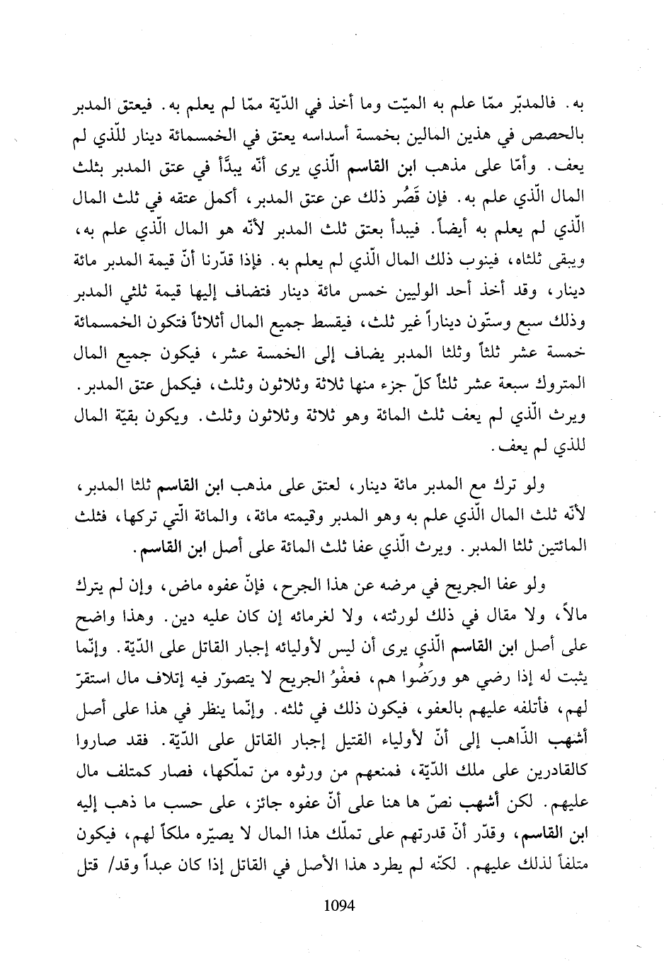 به. فالمدبّر مِمّا علم به الميّت وما أخذ في الدّيّة مِمّا لم يعلم به. فيعتق المدبر بالحصص في هذين المالين بخمسة أسداسه يعتق في الخمسمائة دينار للّذي لم يعف. وأمّا على مذهب ابن القاسم الّذي يرى أنّه يبدَّأ في عتق المدبر بثلث المال الذي علم به. فإن قَصُر ذلك عن عتق المدبر، أكمل عتقه في ثلث المال الّذي لم يعلم به أيضًا. فيبدأ بعتق ثلث المدبر لأنّه هو المال الّذي علم به، ويبقى ثلثاه، فينوب ذلك المال الّذي لم يعلم به. فإذا قدّرنا أن قيمة المدبر مائة دينار، وقد أخذ أحد الوليين خمس مائة دينار فتضاف إليها قيمة ثلثي المدبر وذلك سبع وستون دينارًا غير ثلث، فيقسط جميع المال أثلاثًا فتكون الخمسمائة خمسة عشر ثلثًا وثلثا المدبر يضاف إلى الخمسة عشر، فيكون جميع المال المتروك سبعة عشر ثلثًا كلّ جزء منها ثلاثة وثلاثون وثلث، فيكمل عتق المدبر.