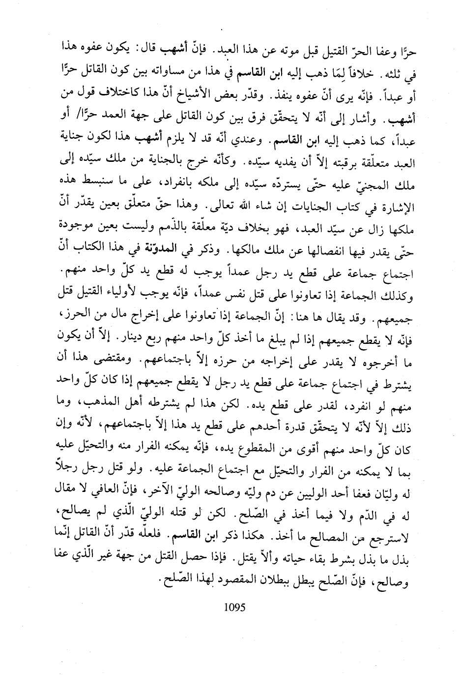 وكذلك الجماعة إذا تعاونوا على قتل نفس محمدًا، فإنّه يوجب لأولياء القتيل قتل جميعهم. وقد يقال ها هنا: إنّ الجماعة إذاْ تعاونوا على إخراج مال من الحرز، فإنّه لا يقطع جميعهم إذا لم يبلغ ما أخذ كلّ واحد منهم ربع دينار. إلاّ أن يكون ما أخرجوه لا يقدر على إخراجه من حرزه إلاّ باجتماعهم. ومقتضى هذا أن يشترط في اجتماع جماعة على قطع يد رجل لا يقطع جميعهم إذا كان كل واحد منهم لو انفرد، لقدر على قطع يده. لكن هذا لم يشترطه أهل المذهب، وما ذلك إلاّ لأنّه لا يتحقّق قدرة أحدهم على قطع يد هذا إلاَّ باجتماعهم، لأنّه وإن كان كل واحد منهم أقوى من المقطوع يده، فإنّه يمكنه الفرار منه والتحيّل عليه بما لا يمكنه من الفرار والتحيّل مع اجتماع الجماعة عليه. ولو قتل رجل رجلًا له وليّان فعفا أحد الوليين عن دم وليّه وصالحه الوليّ الآخر، فإنّ العافي لا مقال له في الدّم ولا فيما أخذ في الصّلح. لكن لو قتله الولي الّذي لم يصالح، لاسترجع حن المصالح ما أخذ. هكذا ذكر ابن القاسم. فلعلّه قدّر أنّ القاتل إنّما بذل ما بذل بشرط بقاء حياته وألاّ يقتل. فإذا حصل القتل من جهة غير الّذي عما وصالح، فإنّ الصّلح يبطل ببطلان المقصود بهذا الصّلح.