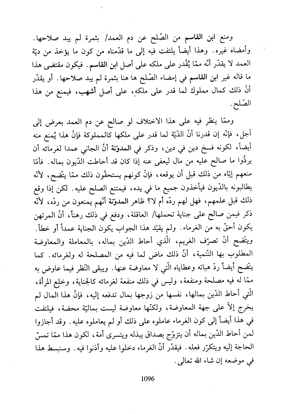 وممّا ينظر فيه على هذا الاختلاف لو صالح عن دم العمد بعرض إلى أجل، فإنّه إن قدرنا أن الدّيّة لما قدر على ملكها كالمملوكة فإنّ هذا يُمنع منه أيضًا، لكونه فسخ دين في دين، وذكر في المدوّنة أنّ الجاني عمدا لغرمائه أن يردُّوا ما صالح عليه من مال ليعفى عنه إذا كان قد أحاطت الدّيون بماله. فأمّا منعهم إيّاه من ذلك قبل أن يوقعه، فإن كونهم يستحقّون ذلك مِمّا يتّضح، لأنه يطالبونه بالدّيون فيأخذون جميع ما في يده، فيمتنع الصلح عليه. لكن إذا وقع ذلك قبل علمهم، فهل لهم ردّه أم لا؟ ظاهر المدوّنة أنّهم يمنعون من ردّه، لأنّه ذكر فيمن صالح على جناية تحملها العاقلة، ودفع في ذلك رهنًا، أنّ المرتهن يكون أحقّ به من الغرماء. ولم يقيّد هذا الجواب يكون الجناية محمدًا أو خطأ.