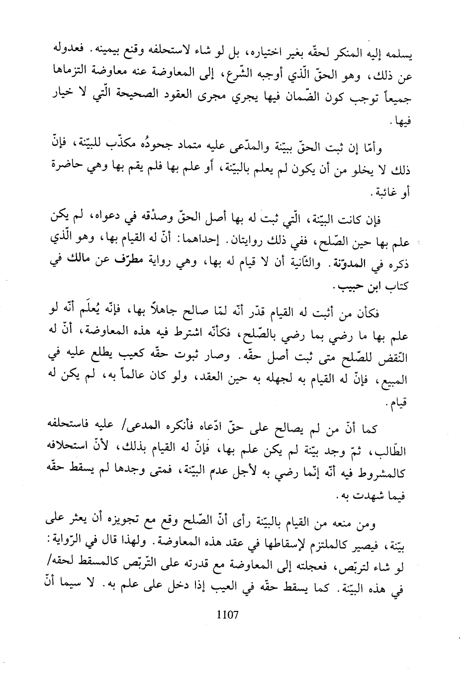 ومن منعه من القيام بالبيّنة رأى أنّ الصّلح وقع مع تجويزه أن يعثر على بيّنة، فيصير كالملتزم لإسقاطها في عقد هذه المعاوضة. ولهذا قال في الرّواية: لو شاء لتربص، فعجلته إلى المعاوضة مع قدرته على التربّص كالمسقط لحقه في هذه البيّنة. كما يسقط حقه في العيب إذا دخل على علم به. لا سيما أنّ