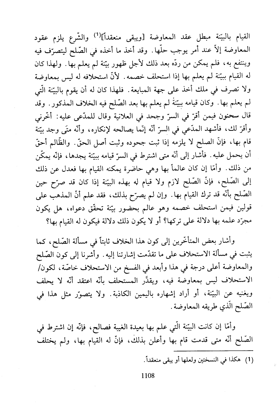 القيام بالبيّنة مبطل عقد المعاوضة [ويبقى منعقدًا] (¬1) والشّرع يلزم عقود المعاوضة إلاَّ عند أمر يوجب حلّها. وقد أخذ ما أخذه في الصّلح ليتصرّف فيه وينتفع به، فلم يمكن من ردّه بعد ذلك لأجل ظهور بيّنة لم يعلم بها. ولهذا كان له القيام ببيّنة لم يعلم بها إذا استحلف خصمه. لأنّ استحلافه له ليس بمعاوضة ولا تصرف في ملك أخذ على جهة المبايعة. فلهذا كان له أن يقوم بالبيّنة الّتي لم يعلم بها. وكان قيامه ببئنة لم يعلم بها بعد الصّلح فيه الخلاف المذكور. وقد قال سحنون فيمن أقرّ في السرّ وجحد في العلانية وقال للمدّعى عليه: أخّرني وأقرّ لك، فأشهد المدّعي في السرّ أنّه إنّما يصالحه لإنكاره، وأنّه متَى وجد بيّنة قام بها، فإنّ الصلح لا يلزمه إذا ثبت جحوده وثبت أصل الحقّ. والظّالم أحق أن يحمل عليه. فأشار إلى أنّه متى اشترط في السرّ قيامه ببيّنة يجدها، فإنّه يمكّن من ذلك. وأمّا إن كان عالمًا بها وهي حاضرة يمكنه القيام بها فعدل عن ذلك إلى الصّلح، فإنّ الصّلح لازم ولا قيام له بهذه البيّنة إذا كان قد صرّح حين الصّلح بأنه قد ترك القيام بها. وإن لم يصرّح بذلك، فقد علم أنّ المذهب على قولين فيمن استحلف خصمه وهو عالم بحضور بينة تحقّق دعواه، هل يكون مجرد علمه بها دلالة على تركها؟ أو لا يكون ذلك دلالة فيكون له القيام بها؟ وأشار بعض المتأخرين إلى كون هذا الخلاف ثابتًا في مسألة الصّلح، كما يثبت في مسألة الاستحلاف على ما تقدّمت إشارتنا إليه. وأشرنا إلى كون الصّلح والمعاوضة أعلى درجة في هذا وأبعد في الفسخ من الاستحلاف خاصّة، لكون الاستحلاف ليس بمعاوضة فيه، ويقدَّر المستحلف بأنّه اعتقد أنّه لا يحلف ويغنيه عن البيّنة، أو أراد إشهاره باليمين الكاذبة. ولا يتصوّر مثل هذا في الصّلح الّذي طريقه المعاوضة.