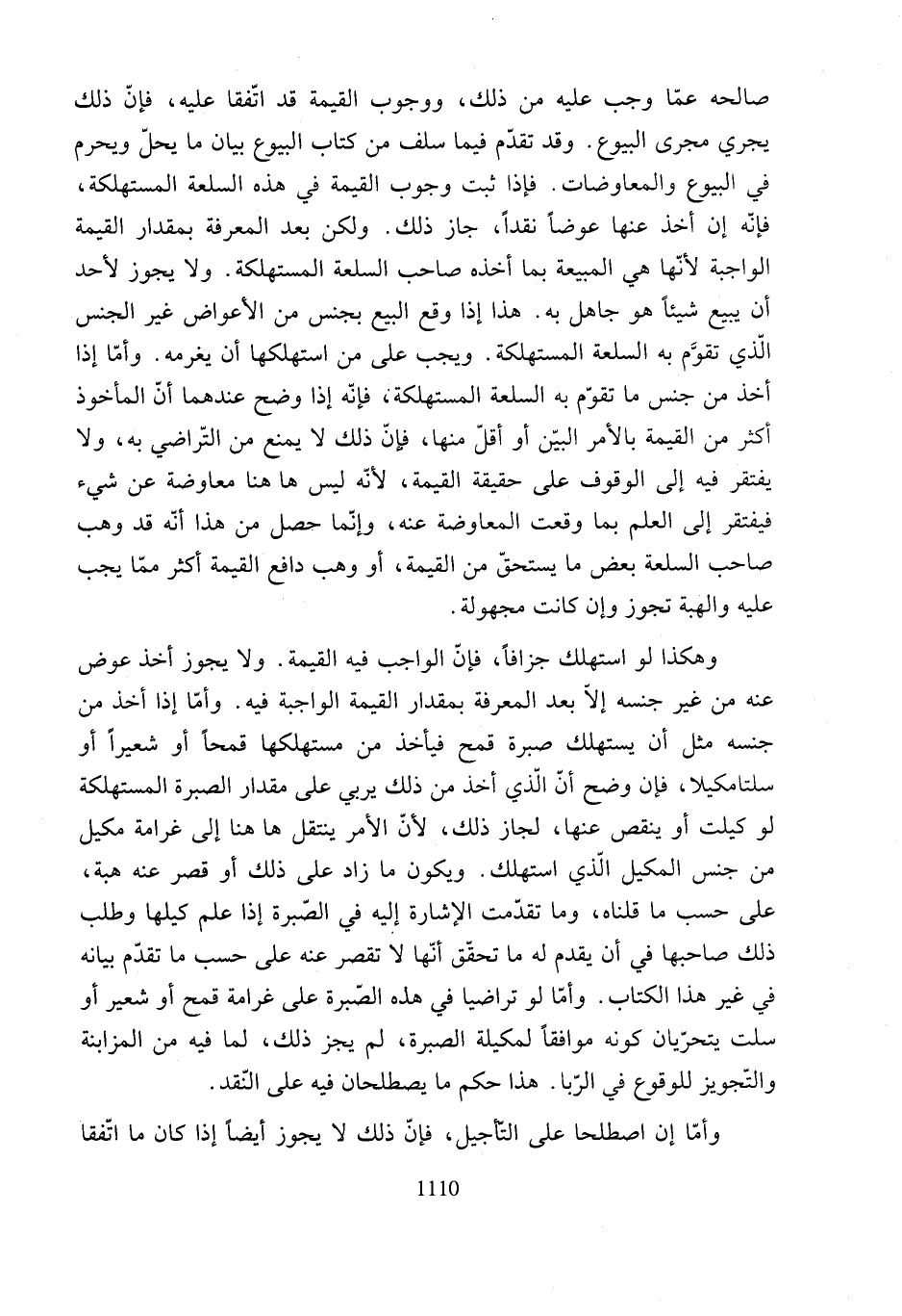 صالحه عمّا وجب عليه من ذلك، ووجوب القيمة قد اتّفقا عليه، فإنّ ذلك يجري مجرى البيوع. وقد تقدّم فيما سلف من كتاب البيوع بيان ما يحلّ ويحرم في البيوع والمعاوضات. فإذا ثبت وجوب القيمة في هذه السلعة المستهلكة، فإنّه إن أخذ عنها عوضًا نقدًا، جاز ذلك. ولكن بعد المعرفة بمقدار القيمة الواجبة لأنّها في المبيعة بما أخذه صاحب السلعة المستهلكة. ولا يجوز لأحد أن يبيع شيئًا هو جاهل به. هذا إذا وقع البيع بجنس من الأعواض غير الجنس الّذي تقوَّم به السلعة المستهلكة. ويجب على من استهلكها أن يغرمه. وأمّا إذا أخذ من جنس ما تقوّم به السلعة المستهلكة، فإنّه إذا وضح عندهما أنّ المأخوذ أكثر من القيمة بالأمر البيّن أو أقلّ منها، فإنّ ذلك لا يمنع من التّراضي به، ولا يفتقر فيه إلى الوقوف على حقيقة القيمة، لأنّه ليس ها هنا معاوضة عن شيء فيفتقر إلى العلم بما وقعت المعاوضة عنه، وإنّما حصل من هذا أنّه قد وهب صاحب السلعة بعض ما يستحقّ من القيمة، أو وهب دافع القيمة أكثر مِمّا يجب عليه والهبة تجوز وإن كانت مجهولة.