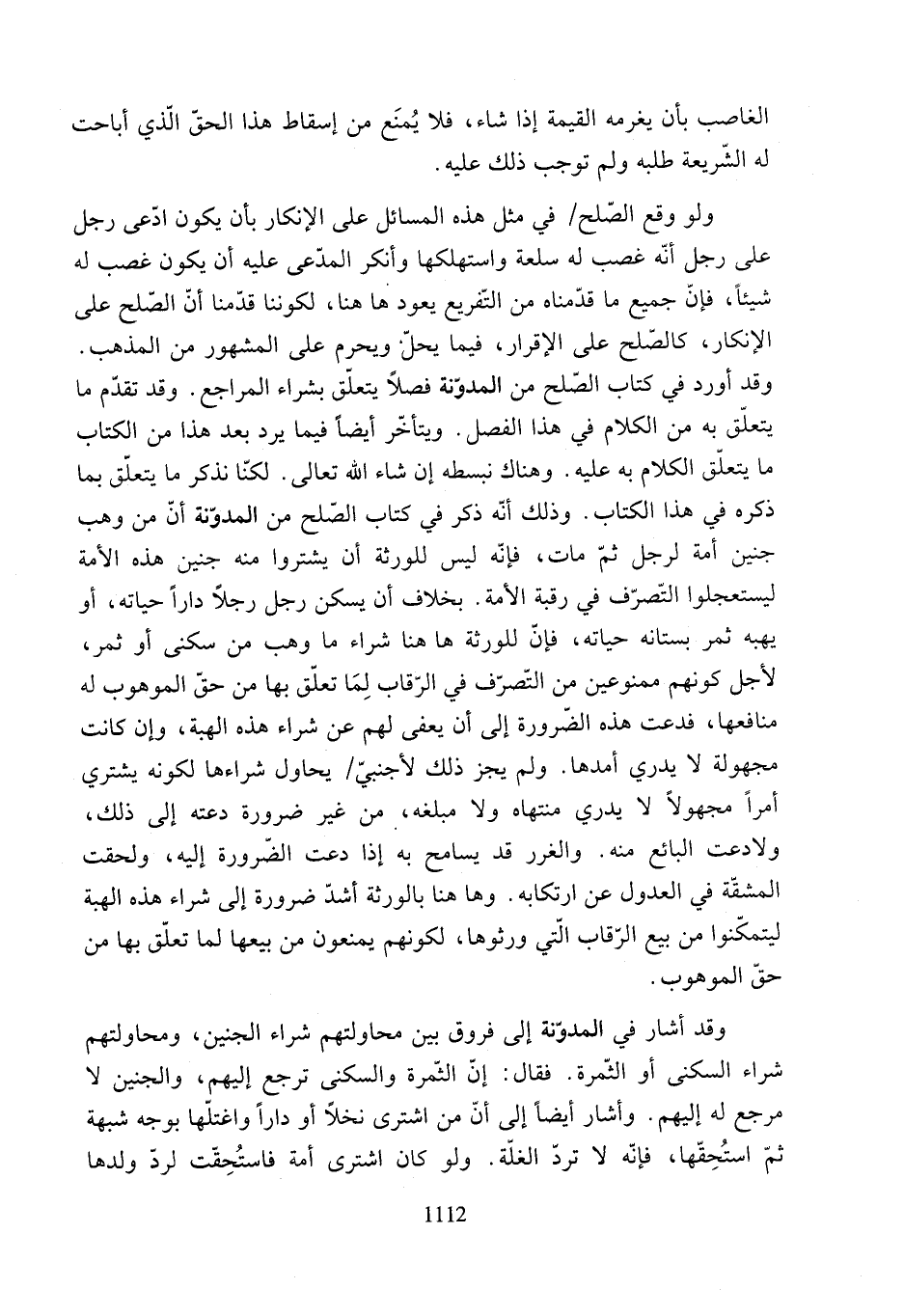 وقد أورد في كتاب الصّلح من المدوّنة فصلًا يتعلّق بشراء المراجع. وقد تقدّم ما يتعلّق به من الكلام في هذا الفصل. ويتأخّر أيضًا فيما يرد بعد هذا من الكتاب ما يتعلق الكلام به عليه. وهناك نبسطه إن شاء الله تعالى. لكنّا نذكر ما يتعلّق بما ذكره في هذا الكتاب. وذلك أنّه ذكر في كتاب الصّلح من المدوّنة أنّ من وهب جنين أمة لرجل ثمّ مات، فإنه ليس للورثة أن يشتروا منه جنين هذه الأمة ليستعجلوا التّصرّف في رقبة الأمة. بخلاف أن يسكن رجل رجلًا دارًا حياته، أو يهبه ثمر بستانه حياته، فإن للورثة ها هنا شراء ما وهب من سكنى أو ثمر، لأجل كونهم ممنوعين من التصرّف في الرّقاب لِمَا تعلّق بها من حقّ الموهوب له منافعها، فدعت هذه الضّرورة إلى أن يعفى لهم عن شراء هذه الهبة، وإن كانت جهولة لا يدري أمدها. ولم يجز ذلك لأجنبيّ يحاول شراءها لكونه يشتري أمرًا مجهولًا لا يدري منتهاه ولا مبلغه، من غير ضرورة دعته إلى ذلك، ولادعت البائع منه. والغرر قد يسامح به إذا دعت الضرورة إليه، ولحقت المشقّة في العدول عن ارتكابه. وها هنا بالورثة أشدّ ضرورة إلى شراء هذه الهبة ليتمكّنوا من بيع الرّقاب الّتي ورثوها, لكونهم يمنعون من بيعها لما تعلّق بها من حق الموهوب.
