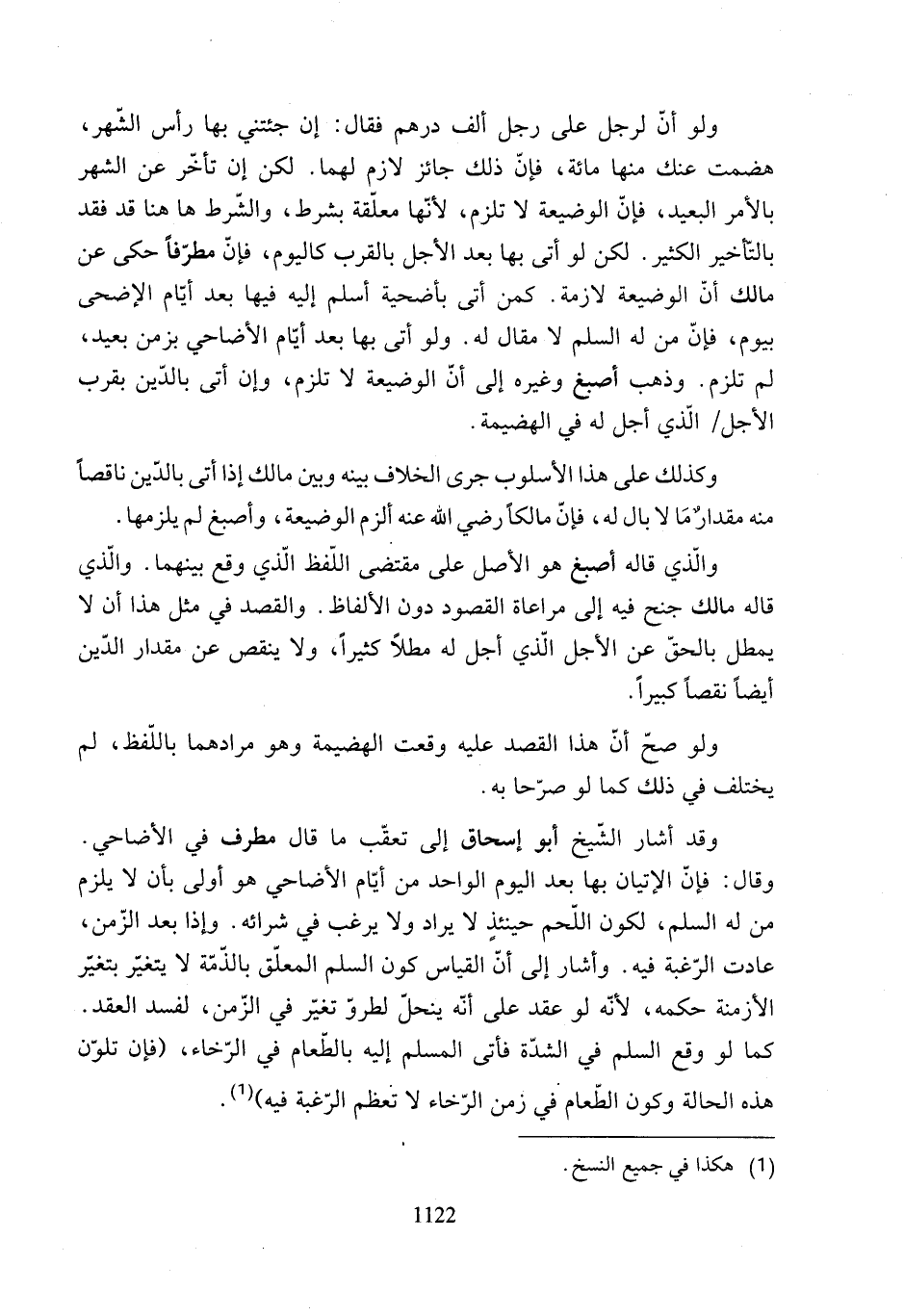 وقال: فإنّ الإتيان بها بعد اليوم الواحد من أيّام الأضاحي هو أولى بأن لا يلزم من له السلم، لكون اللّحم حينئذٍ لا يراد ولا يرغب في شرائه. وإذا بعد الزّمن، عادت الرّغبة فيه. وأشار إلى أنّ القياس كون السلم المعلّق بالذمّة لا يتغيّر بتغيّر الأزمنة حكمه؛ لأنه لو عقد على أنّه ينحلّ لطروّ تغيّر في الزّمن، لفسد العقد.