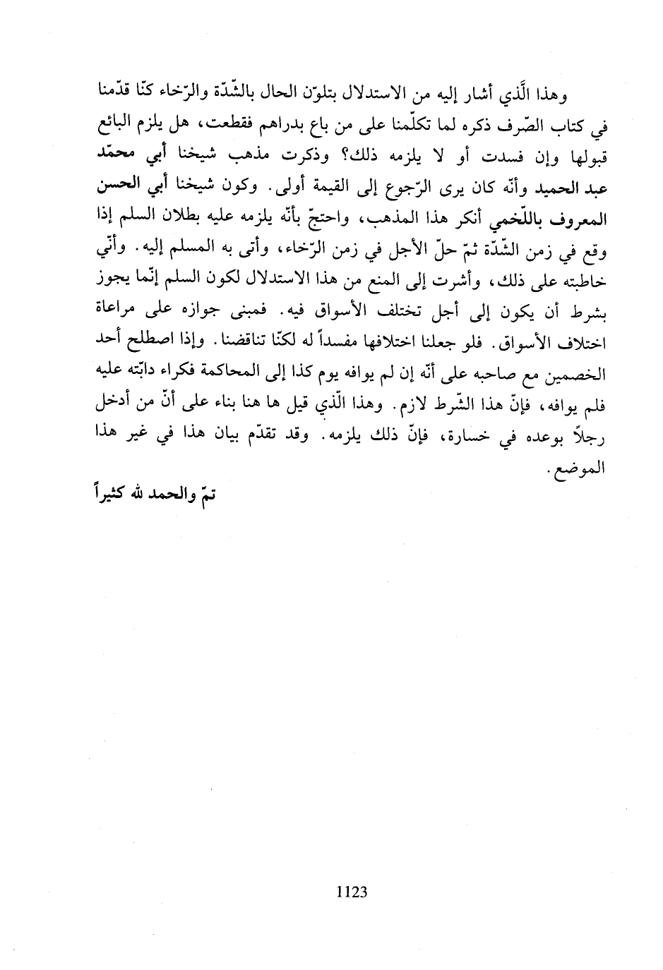 وهذا الَّذي أشار إليه من الاستدلال بتلوّن الحال بالشّدّة والرّخاء كنّا قدّمنا في كتاب الصّرف ذكره لما تكلمنا على من باع بدراهم فقطعت، هل يلزم البائع قبولها وإن فسدت أو لا يلزمه ذلك؟ وذكرت مذهب شيخنا أبي محمّد عبد الحميد وأنّه كان يرى الرّجوع إلى القيمة أولى. وكون شيخنا أبي الحسن المعروف باللّخمي أنكر هذا المذهب، واحتجّ بأنّه يلزمه عليه بطلان السلم إذا وقع في زمن الشّدّة ثم حلّ الأجل في زمن الرخاء، وأتى به المسلم إليه. وأنّي خاطبته على ذلك، وأشرف إلى المنع من هذا الاستدلال لكون السلم إنّما يجوز بشرط أن يكون إلى أجل تختلف الأسواق فيه. فمبنى جوازه على مراعاة اختلاف الأسواق. فلو جعلنا اختلافها مفسدًا له لكنا تناقضنا. وإذا اصطلح أحد الخصمين مع صاحبه على أنه إن لم يوافه يوم كذا إلى المحاكمة فكراء دابّته عليه فلم يوافه، فإنّ هذا الشّرط لازم. وهذا الّذي قيل ها هنا بناء على أنّ من أدخل رجل أبو عده في خسارة، فإن ذلك يلزمه. وقد تقدّم بيان هذا في غير هذا الموضع.
