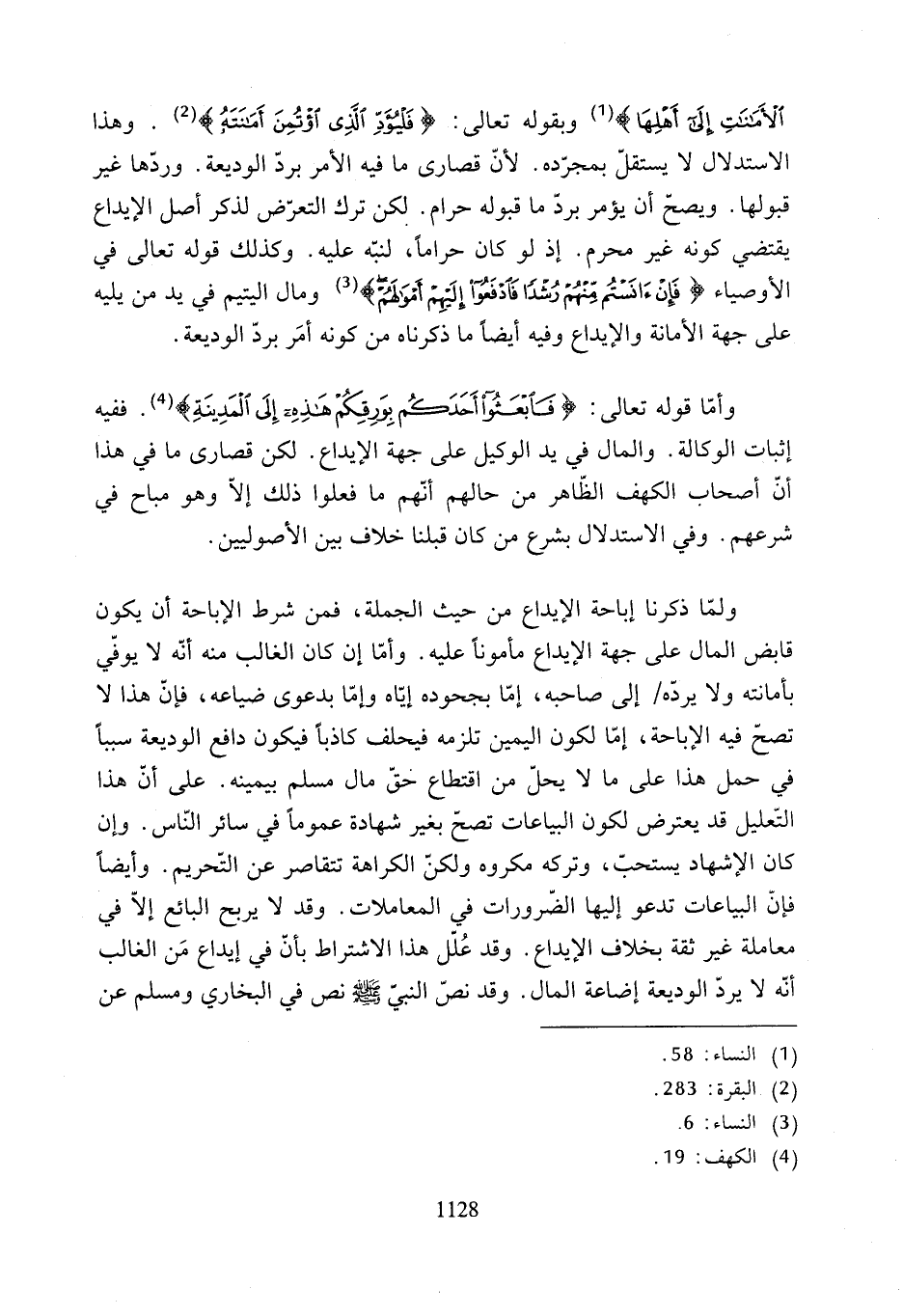 الْأَمَانَاتِ إِلَى أَهْلِهَا} (¬1) وبقوله تعالى: {فَلْيُؤَدِّ الَّذِي اؤْتُمِنَ أَمَانَتَهُ} (¬2). وهذا الاستدلال لا يستقل بمجرّده. لأنّ قصارى ما فيه الأمر بردّ الوديعة. وردها غير قبولها. ويصح أن يؤمر بردّ ما قبوله حرام. لكن ترك التعرض لذكر أصل الإيداع يقتضي كونه غير محرم. إذ لو كان حرامًا، لنبه عليه. وكذلك قوله تعالى في الأوصياء {فَإِنْ آنَسْتُمْ مِنْهُمْ رُشْدًا فَادْفَعُوا إِلَيْهِمْ أَمْوَالَهُمْ} (¬3) ومال اليتيم في يد من يليه على جهة الأمانة والإيدل وفيه أيضًا ما ذكرناه من كونه أمَر بردّ الوديعة.