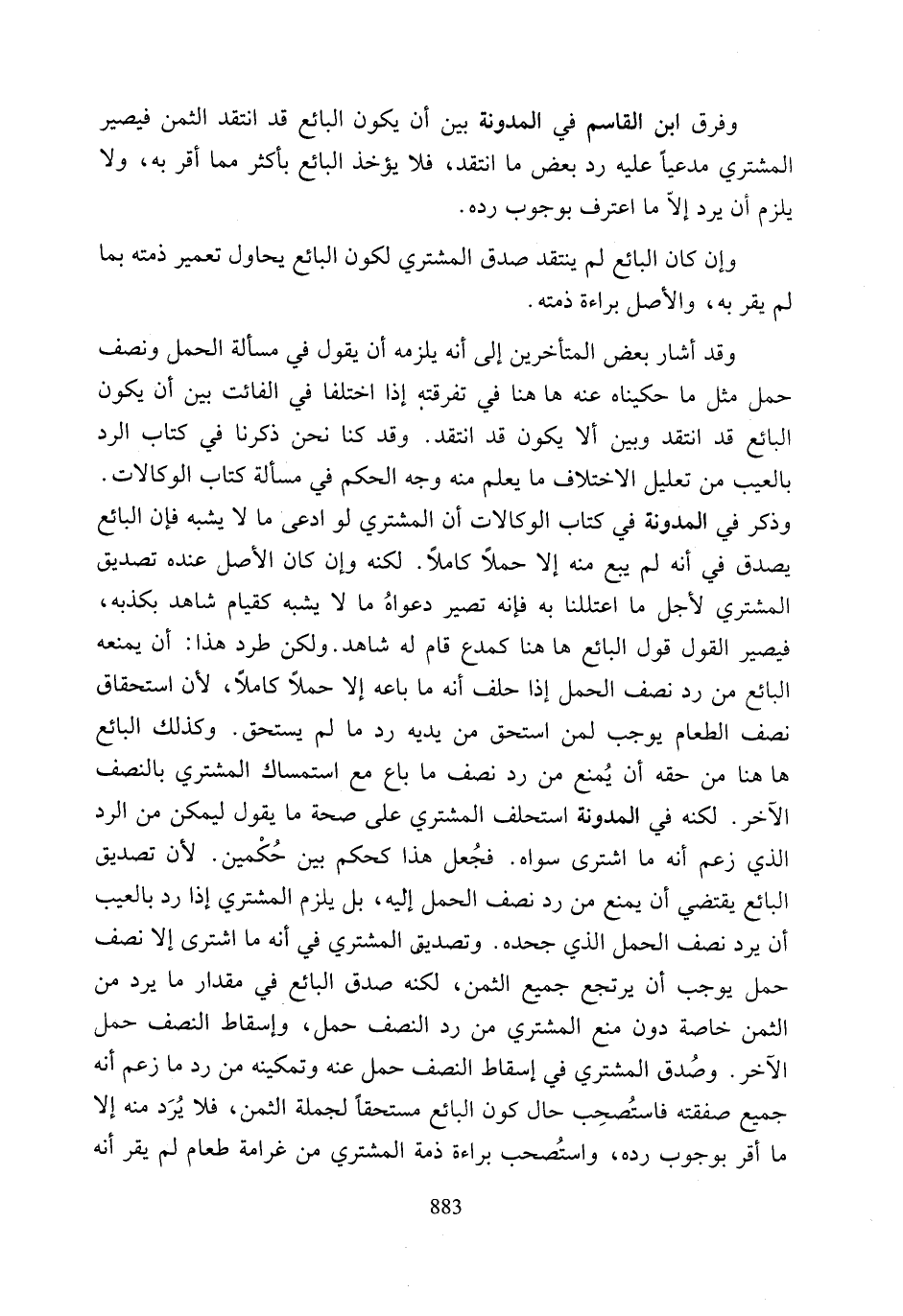 وذكر في المدونة في كتاب الوكالات أن المشتري لو ادعى ما لا يشبه فإن البائع يصدق في أنه لم يبع منه إلا حملًا كاملًا. لكنه وإن كان الأصل عنده تصديق المشتري لأجل ما اعتللنا به فإنه تصير دعواهُ ما لا يشبه كقيام شاهد بكذبه، فيصير القول قول البائع ها هنا كمدع قام له شاهد. ولكن طرد هذا: أن يمنعه البائع من رد نصف العمل إذا حلف أنه ما باعه إلا حملًا كاملًا، لأن استحقاق نصف الطعام يوجب لمن استحق من يديه رد ما لم يستحق. وكذلك البائع ها هنا من حقه أن يُمنع من رد نصف ما باع مع استمساك المشتري بالنصف الآخر. لكنه في المدونة استحلف المشتري على صحة ما يقول ليمكن من الرد الذي زعم أنه ما اشترى سواه. فجُعل هذا كحكم بين حُكْمين. لأن تصديق البائع يقتضي أن يمنع من رد نصف العمل إليه، بل يلزم المشتري إذا رد بالعيب أن يرد نصف العمل الذي جحده. وتصديق المشتري في أنه ما اشترى إلا نصف حمل يوجب أن يرتجع جميع الثمن، لكنه صدق البائع في مقدار ما يرد من الثمن خاصة دون منع المشتري من رد النصف حمل، وإسقاط النصف حمل الآخر. وصُدق المشتري في إسقاط النصف حمل عنه وتمكينه من رد ما زعم أنه جميع صفقته فاستُصحِب حال كون البائع مستحقًا لجملة الثمن، فلا يُرَد منه إلا ما أقر بوجوب رده، واستُصحب براءة ذمة المشتري من غرامة طعام لم يقر أنه