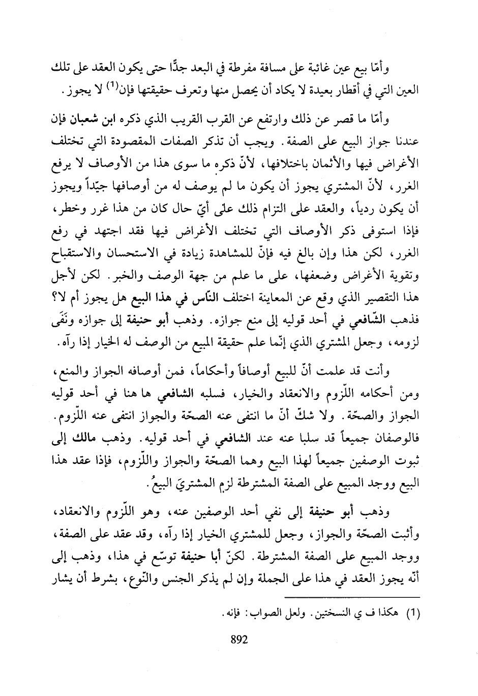 وأمّا ما قصر عن ذلك وارتفع عن القرب القريب الذي ذكره ابن شعبان فإن عندنا جواز البيع على الصفة. ويجب أن تذكر الصفات المقصودة التي تختلف الأغراض فيها والأثمان باختلافها، لأنّ ذكره ما سوى هذا من الأوصاف لا يرفع الغرر، لأنّ المشتري يجوز أن يكون ما لم يوسف له من أوصافها جيّدًا ويجوز أن يكون رديًا، والعقد على التزام ذلك على أيّ حال كان من هذا غرر وخطر، فإذا استوفى ذكر الأوصاف التي تختلف الأغراض فيها فقد اجتهد في رفع الغرر، لكن هذا وإن بالغ فيه فإن للمشاهدة زيادة في الاستحسان والاستقباح وتقوية الأغراض وضعفها، على ما علم من جهة الوصف والخبر. لكن لأجل هذا التقصير الذي وقع عن المعاينة اختلف النّاس في هذا البيع هل يجوز أم لا؟ فذهب الشّافعي في أحد قوليه إلى منع جوازه. وذهب أبو حنيفة إلى جوازه ونَفَى لزومه، وجعل المشتري الذي إنّما علم حقيقة المبيع من الوصف له الخيار إذا رآه.